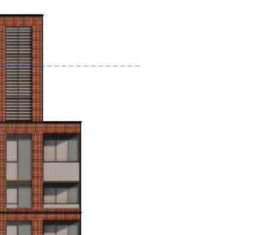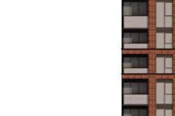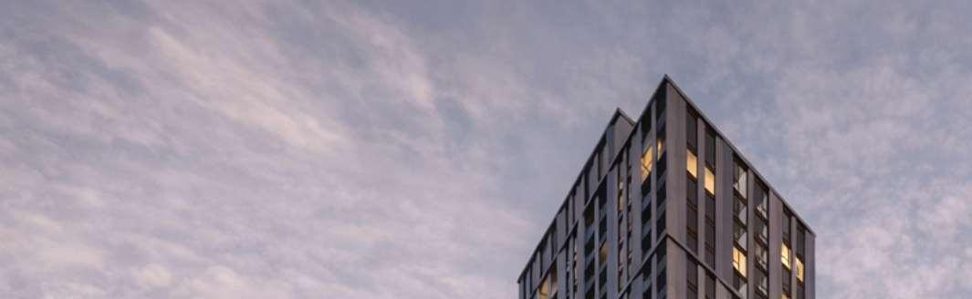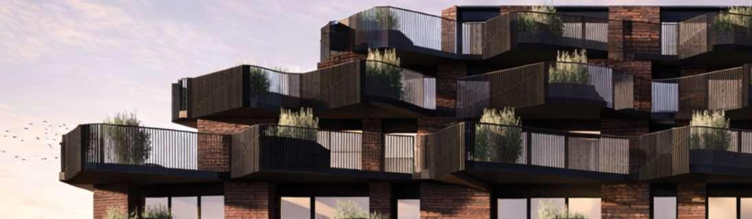 The 8-storey, 123-unit building is shaped by a modulated massing strategy that reduces perceived scale and responds to the site’s topography. Its architectural expression draws on the site’s natural character, using a refined material palette that complements Bolton’s evolving urban fabric while maintaining a strong relationship to the southern landscape edge. A material transition at the corner visually divides the building into two masses, reducing its apparent bulk. An alternative scheme explored a more fluid expression with continuous, undulating balconies.