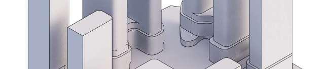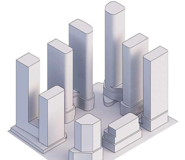 ThisproposalreimaginestheexistingWoodbridgeSquareshoppingcentre,located at the intersection of Weston Road and Highway 7, as a mixed-use community in downtown Vaughan. The project comprises nine towers ranging from 12 to 57 storeys, and delivers 4,388 residential units and ground-level retail, including a large grocery store. Starting from an extruded site block, the mass was strategically carved to shape the buildings while accommodating light, views, and streetscape connections. This process established a central open area — a privately owned public space (POPS) of over 3,700 m² — where curved forms introduce continuity and spatial flow,with buildingheightssteppingdowntoward the south to optimize solar access.
