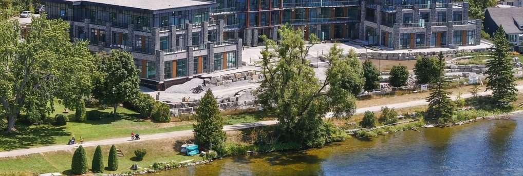 Situatedat99Louisa Street inFenelonFalls,thebuilding isathreestorey, 57-unit condominium that integrates contemporary lodge architecture with prairie influences and its lakeside setting. The project highlights materiality and form through a façade that pairs two tones of stone for depth and texture, wood-clad elements that add warmth and a resort character, and expansive glazing that enhances transparency and views.