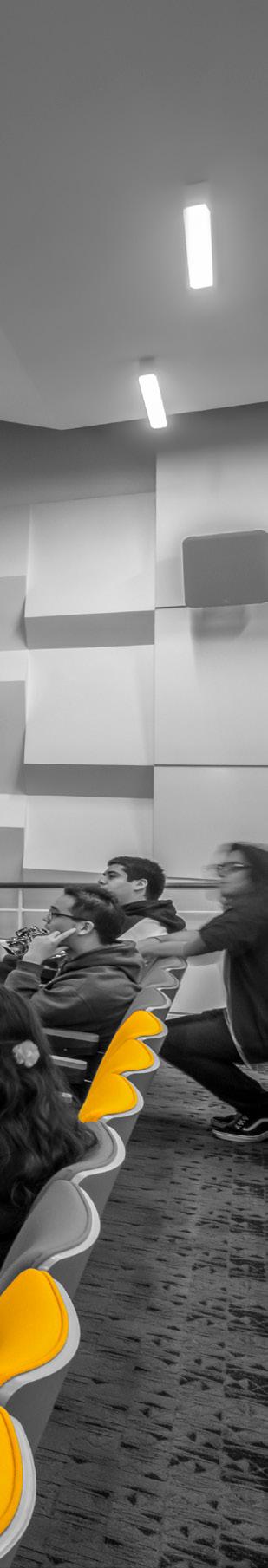 Embracing the concept of “The Pattern of Sound,” the design features meticulously shaped acoustic wall panels that reflect the unique digital and musical soundwave lengths of each program. These panels come together to create a captivating pattern, highlighting the space’s integral role in the school’s educational mission and enriching the learning opportunities for students and audiences alike.