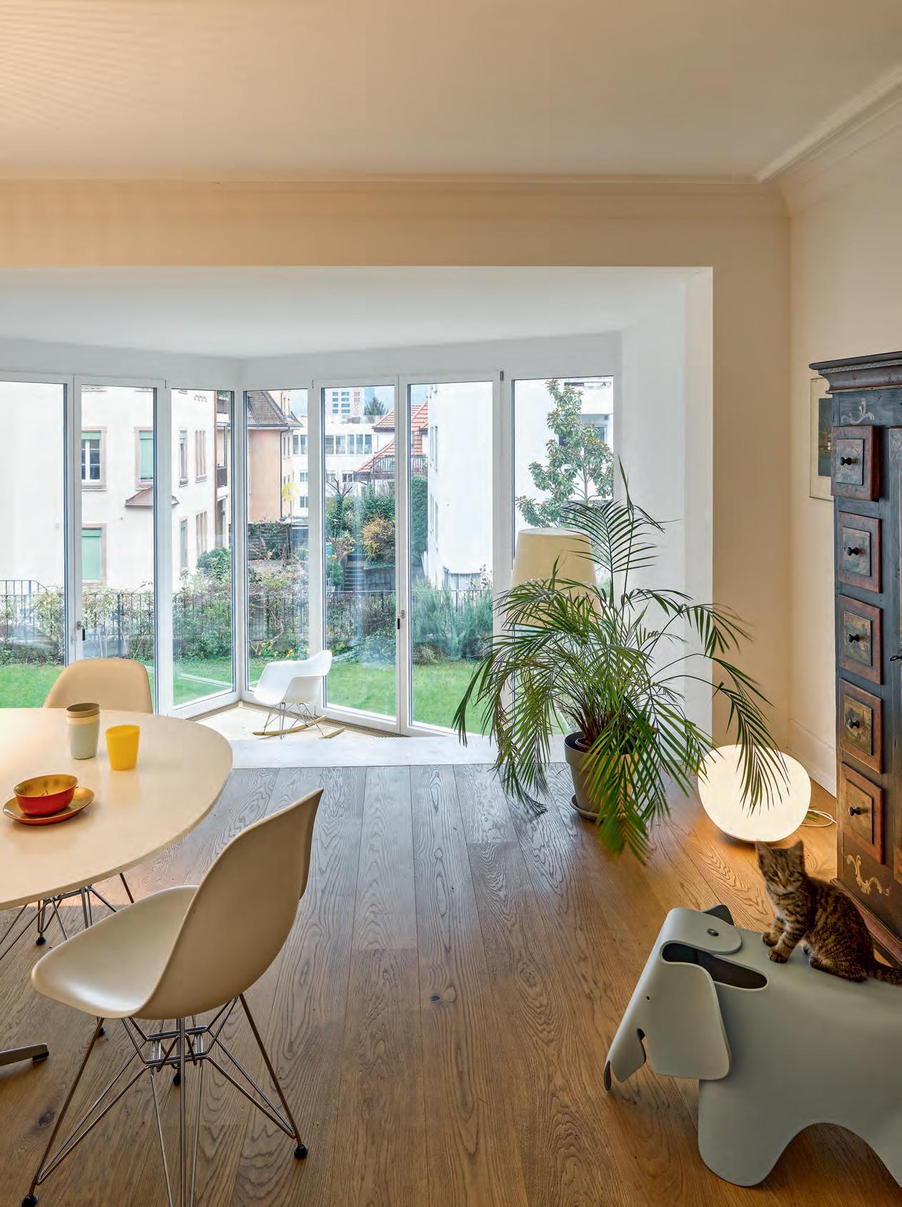 Mit einem pointierten Anbau verbindet die Architektin Nina Anaïs Geschosse eines Doppeleinfamilienhausteils von 1923, die zu unterschiedlichen Zeiten entstanden sind, und schafft für die Besitzerfamilie mehr Wohnraum und Bezug nach aussen.