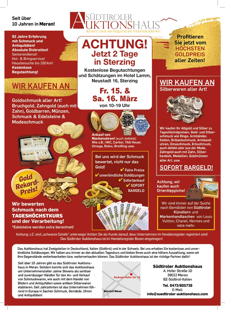 Das unter der Höhe des Jaufenpasses gelegene Sterzinger Unterkunftshaus, bekanntlich ein sehr beliebter Stützpunkt für Bergsteiger und Skifahrer, wurde vom Gasthofbesitzer A. Mayr-Figl in Bozen käuflich erworben und wird von diesem mit 25. Mai laufenden Jahres geführt werden. Dadurch ist wieder ein für den Touristen- und Fremdenverkehr unseres weiteren Gebietes bedeutsames Unternehmen in die Hände eines tüchtigen Bozner Gastwirtes gelangt und wird von diesem in bewährter Weise geleitet werden. Seit dem zunehmenden Autoverkehr bildet das landschaftlich reizend gelegene Jaufenhaus auch eine sehr gerne gewählte Raststation in der Verkehrsstrecke Meran-Jaufen-Sterzing-Gossensaß.