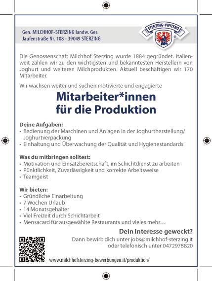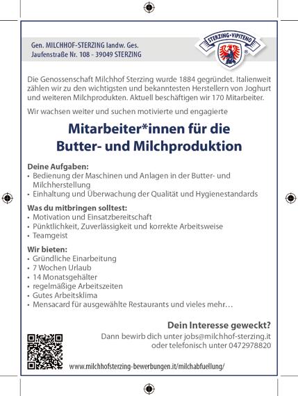 Dann bewirb dich unter jobs@milchoof-sterzing.it oder telefonisch unter 0472978820