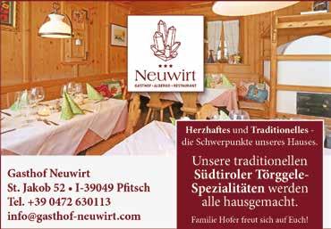 Zum 35-jährigen Bestehen haben wir auch Ihre Meinung eingeholt; die Ergebnisse der Umfrage können Sie in dieser Ausgabe nachlesen. Daneben finden Sie in dieser Ausgabe eine Reihe weiterer denkwürdiger runder Geburtstage. Redakteurin Barbara Felizetti Sorg stellt Ihnen in unserer Titelgeschichte den geplanten Neubau der Landshuter Europahütte vor, die 125 Jahre auf dem Buckel hat und ins Wanken geraten ist. Ein fürwahr herausforderndes grenzüberschreitendes Projekt in europäischem Geiste. Auf 90 Jahre blickt die Firma Troyer zurück und seit 25 Jahren gibt es bereits auch die Geschichtswerkstatt Freienfeld.