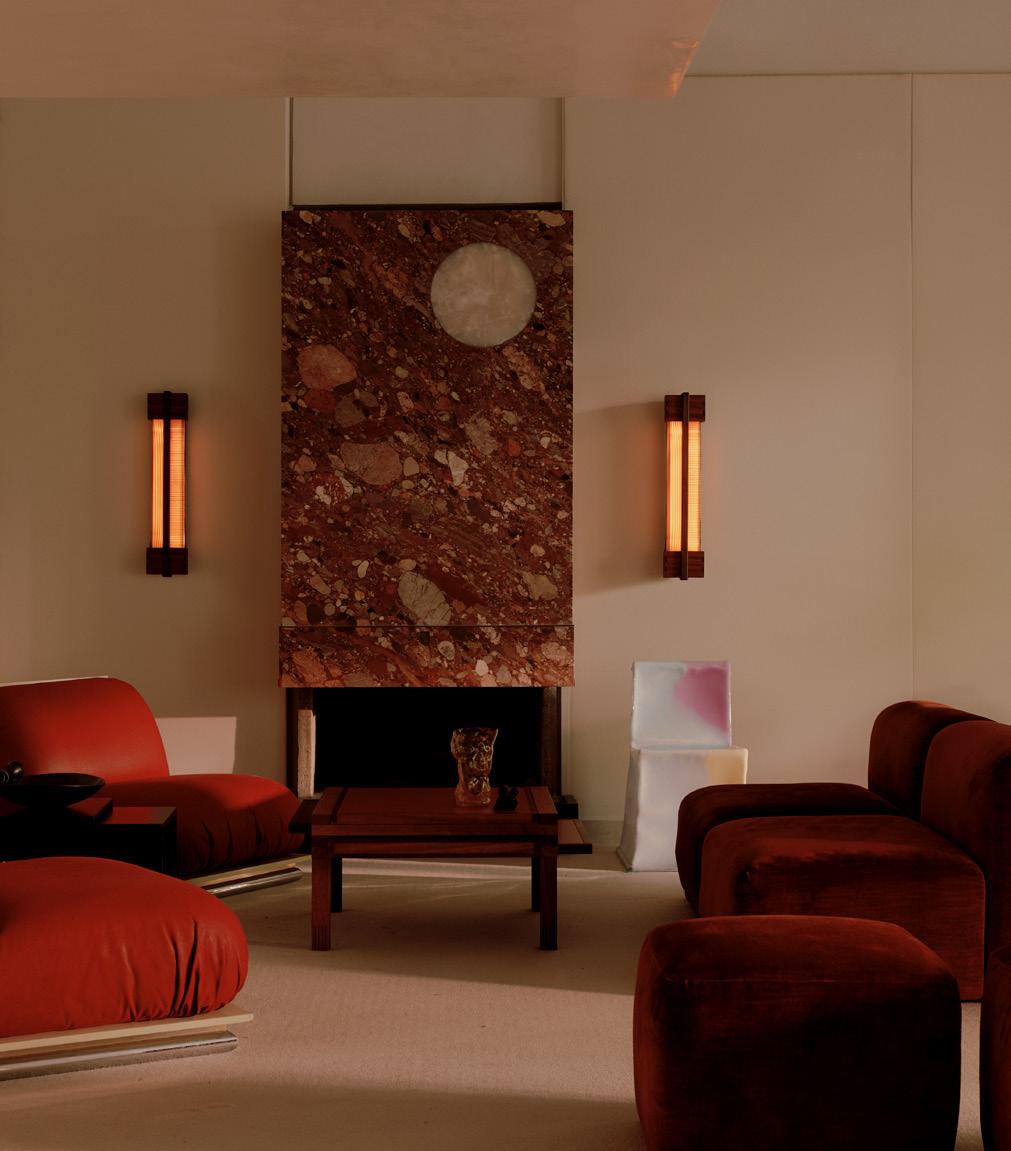 Strata, a recent lighting collection by In Common With, relies on two experimental techniques. The first uses the application of glass powder to glass sheets, much like silk-screening, and the second relies on the assembly of glass pieces into mosaics that are then kiln fired. Expressive and sleek, the resulting surface-mount sconces can be used in a variety of configurations. To showcase the pieces, In Common With founders Felicia Hung and Nick Ozemba decamped to Italy. They set up within the little-known Villa Vittoriano Viganò, named for its designer, a 20th-century Milanese architect. The staging works: The interior’s colors, textures, and sensibility offer a supportive environment for the handmade geometric fixtures.