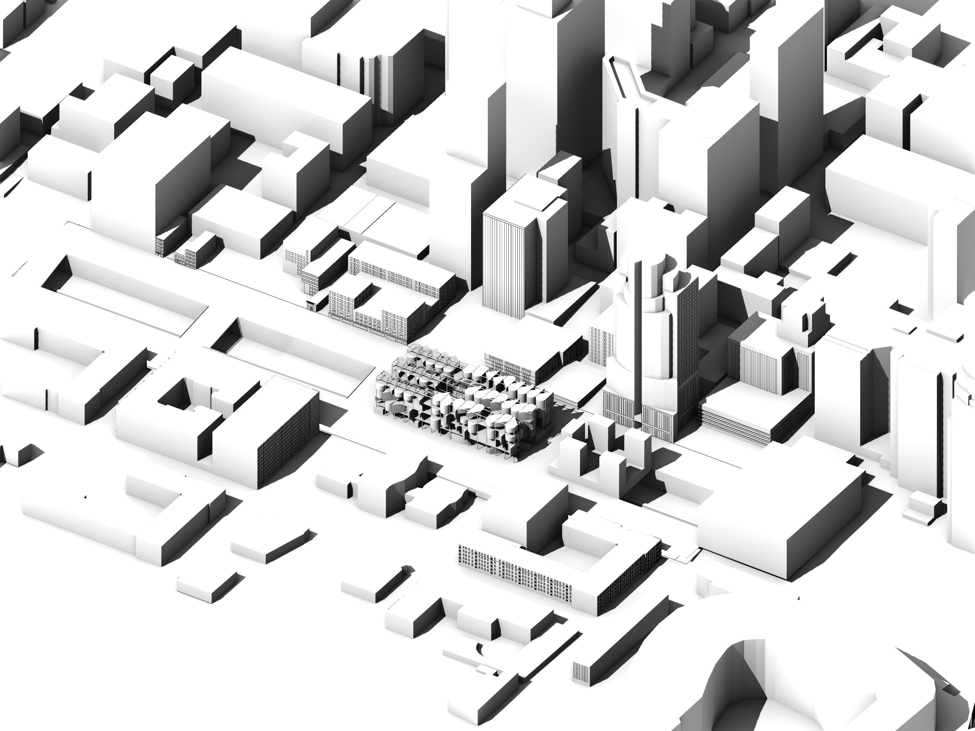 Our infrastructure is a larger than life space fragmented into the human scale with programmatic modules. We combine this with an open ground floor to emphasize transparency with the city scape that surrounds.