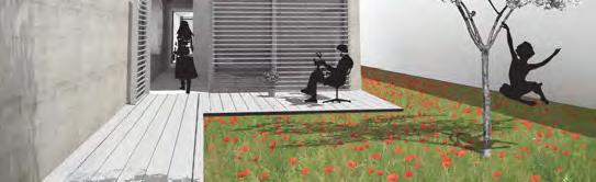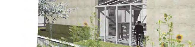 A l’ouest des communs, l’ensemble du « jardin suspendu » existant sera repris audessusd’unnouveau murdesoutènementquiviendraremplacer celuiexistantenblocsparpaings. Appuyée sur ce nouveau mur, une large terrasse viendra en avant de la piscine, ainsi masquée depuis la tour. La piscine sera accessible via un escalier dissimulé dans le nouveau mur de soutènement. Souslaterrasse,grâceaureliefexistantet l’excavation du terrain, de nouveau locaux serontaménageables.