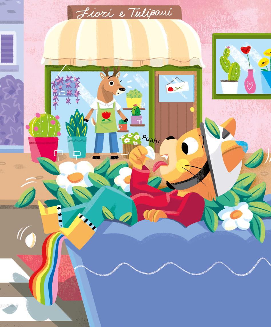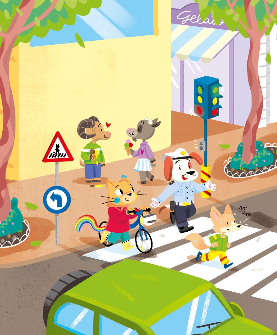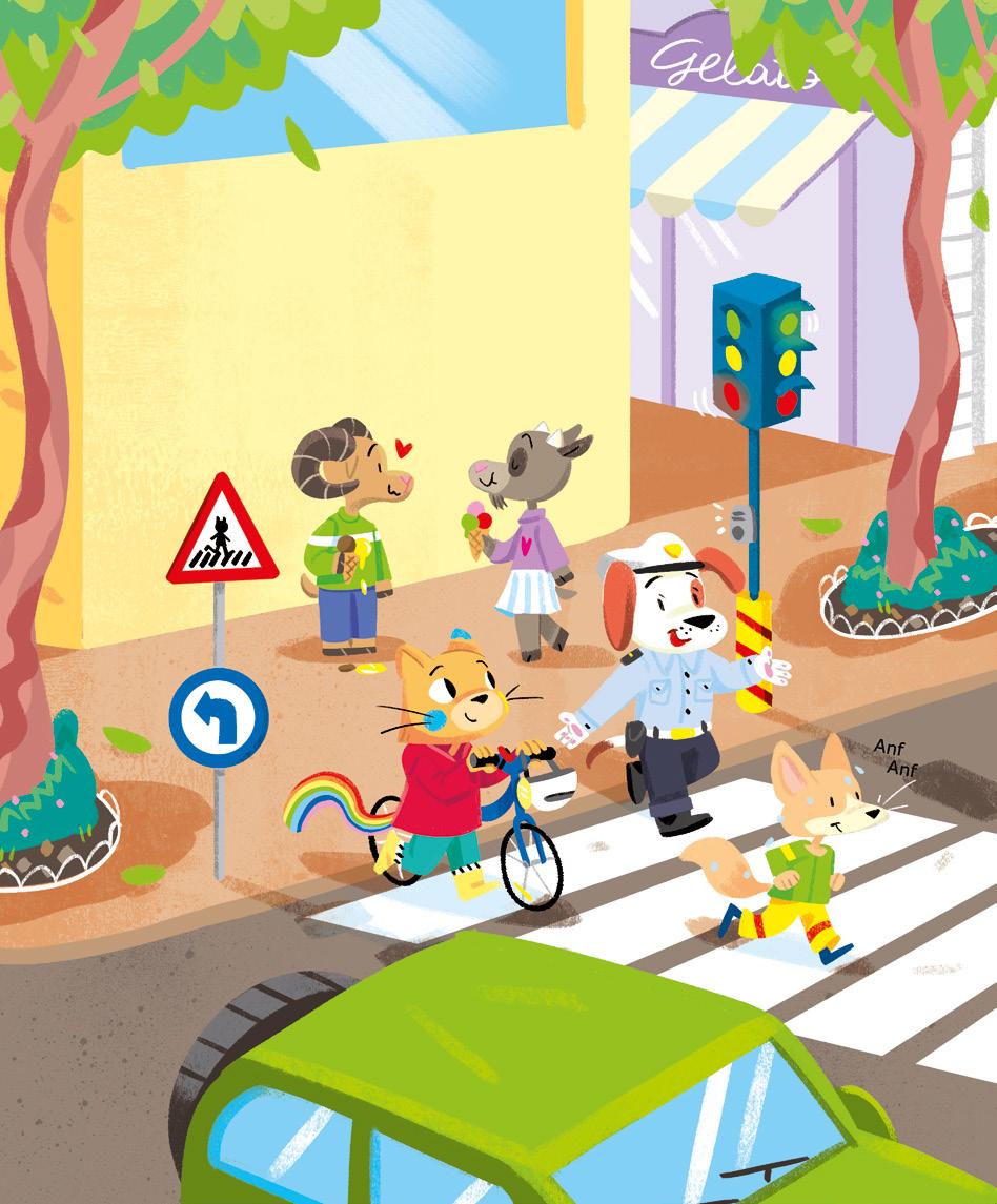 – Attento, gattino! – ha gridato il vigile dal suo fischietto d’argento. – Il rosso vuol dire fermati! – ha ripetuto più volte. Arcobaleo è arrossito fin sulla punta delle orecchie e si è irrigidito come una statuina di porcellana tanto si è spaventato.