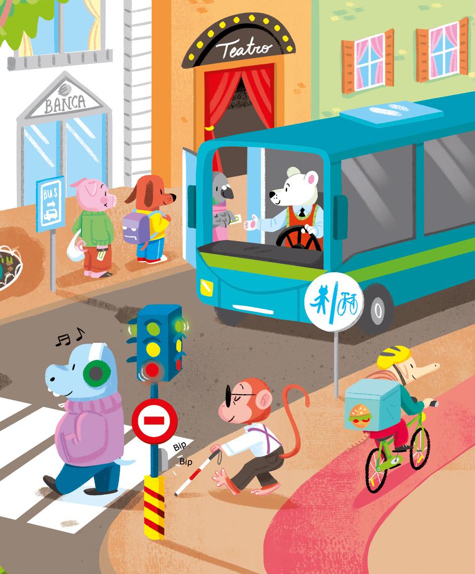 Il vigile ha sorriso: – Ora ti spiego come funziona la città. Insieme hanno attraversato sulle strisce pedonali, Arcobaleo ha subito imparato i colori del semaforo e i segnali stradali.