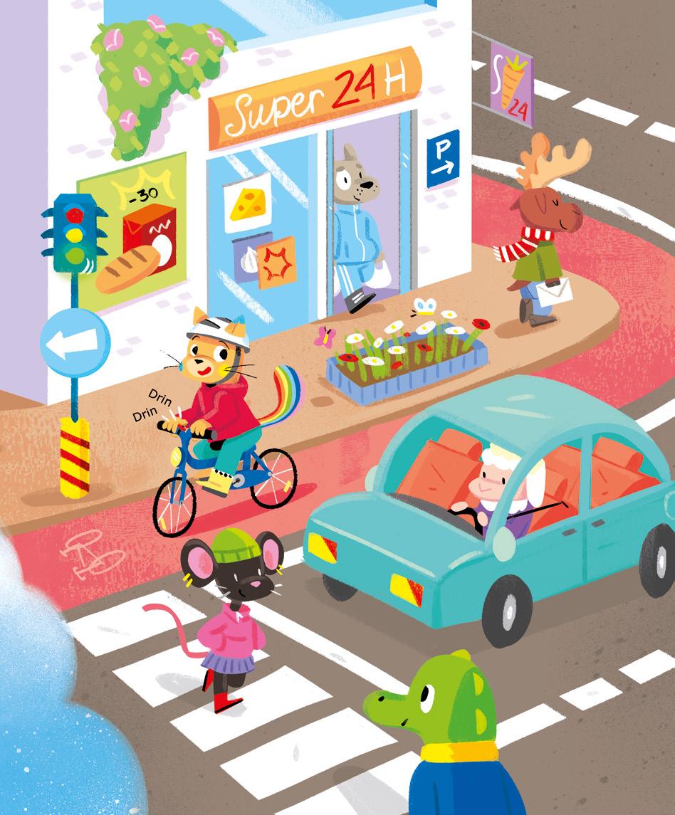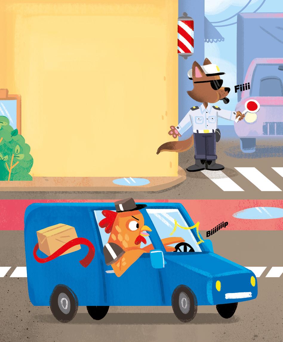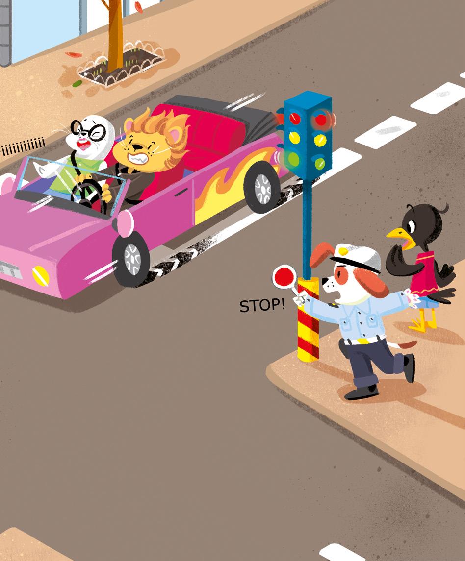 ”Ma dove sono capitato?” ha pensato il gattino, quando ha visto un cane con la divisa da vigile, un elefante al volante di un’auto lucente e, poco più in là, un grosso gallo alla guida di un’altra.