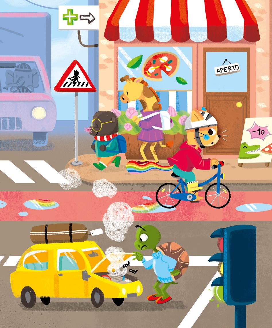 Poco dopo Arcobaleo è arrivato a un incrocio. Un semaforo grande come una giraffa brillava davanti a lui. Era rosso, ma Arcobaleo non ci ha fatto caso e ha continuato a pedalare. Zac! Una macchina ha frenato all’improvviso.