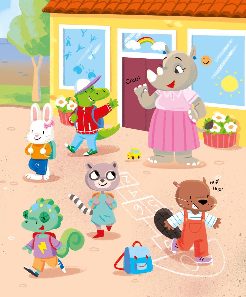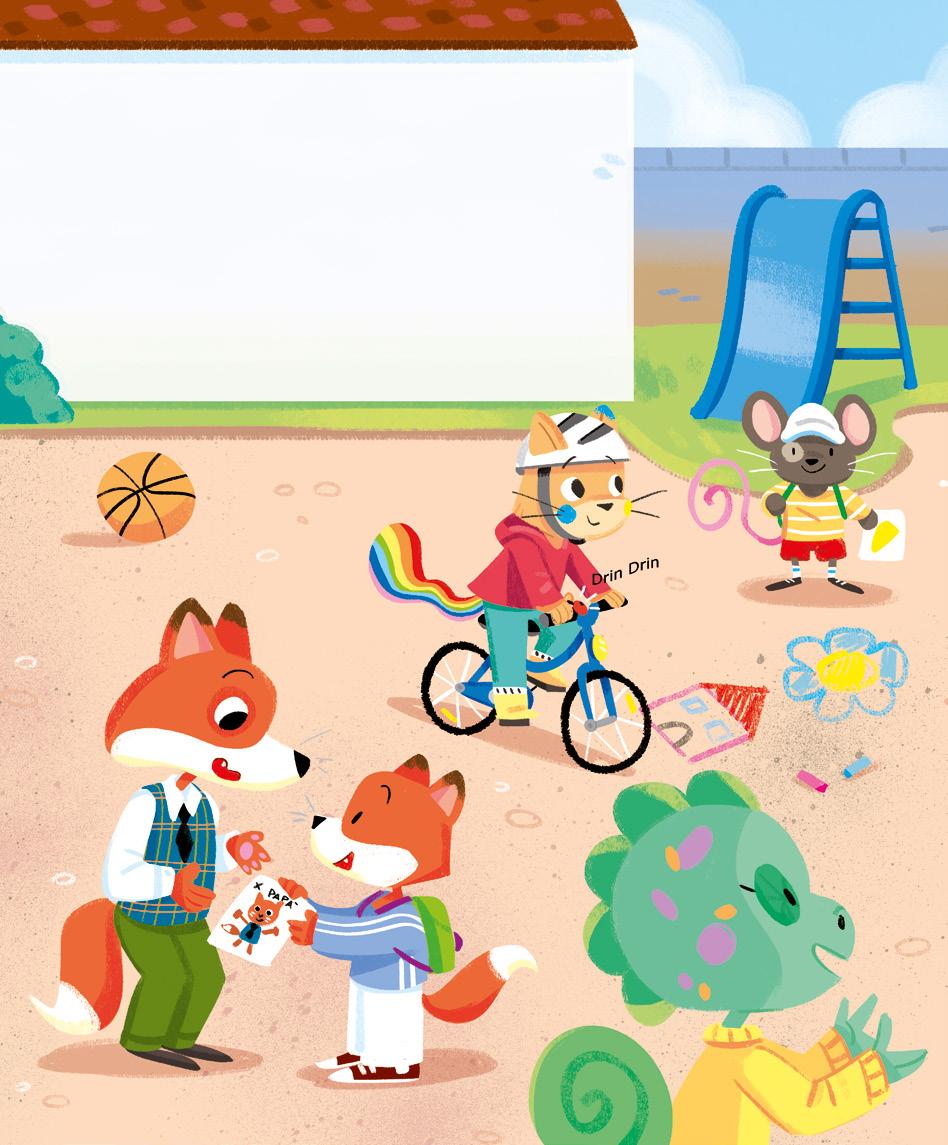 Dopo aver salutato i suoi compagni di classe, Arcobaleo è montato sulla bici e, in un attimo, il cortile si è riempito di nuovi amici con code morbide e piccole zampe.