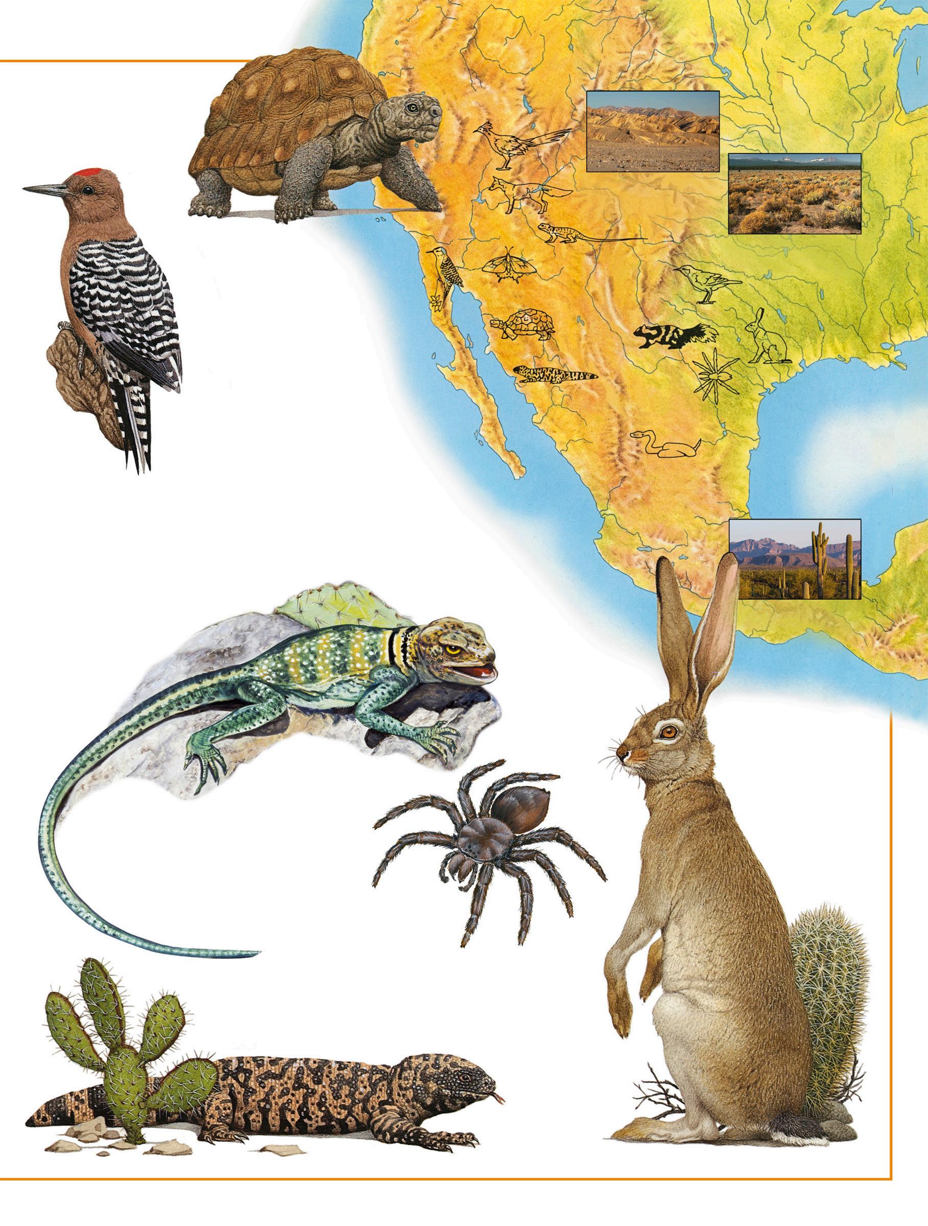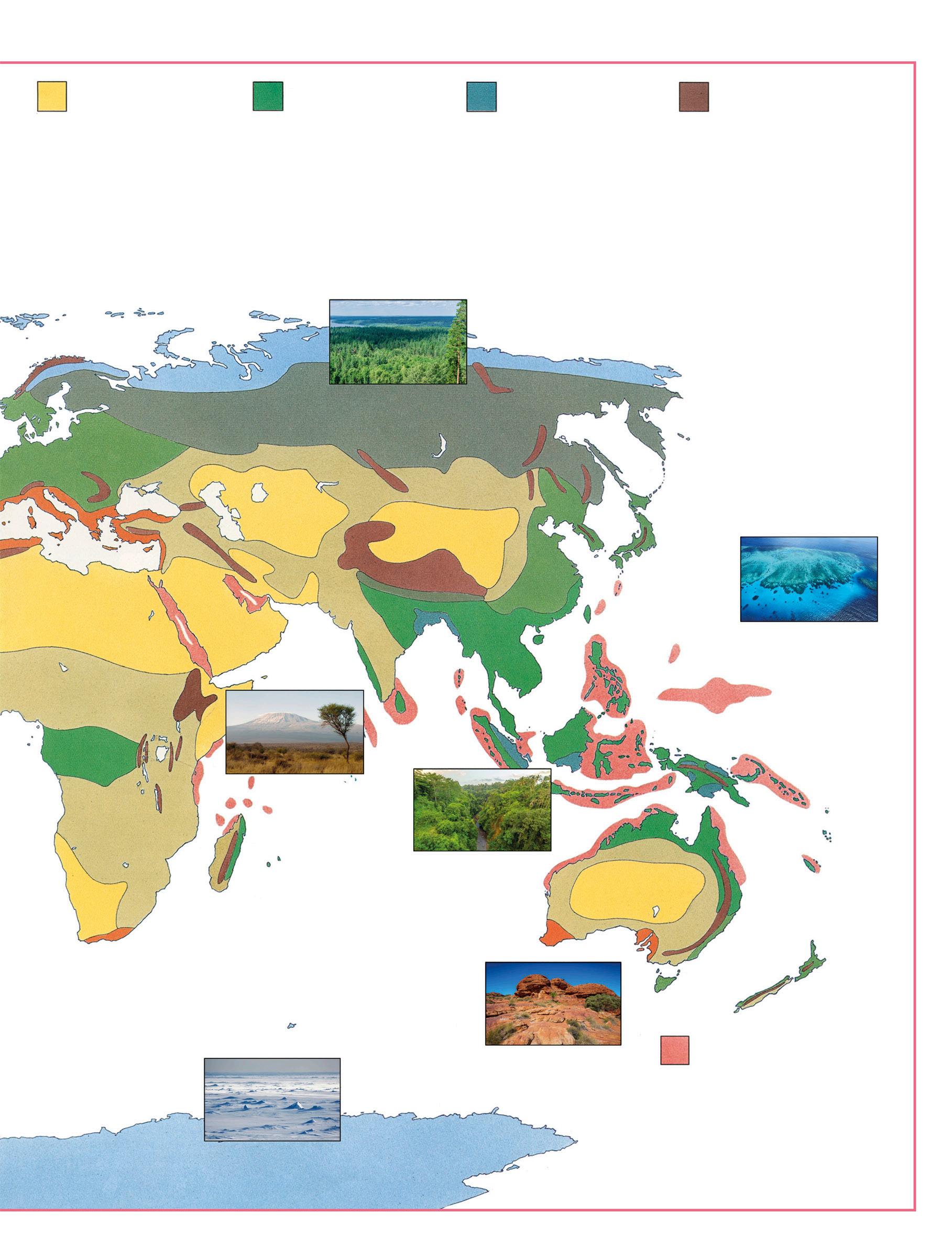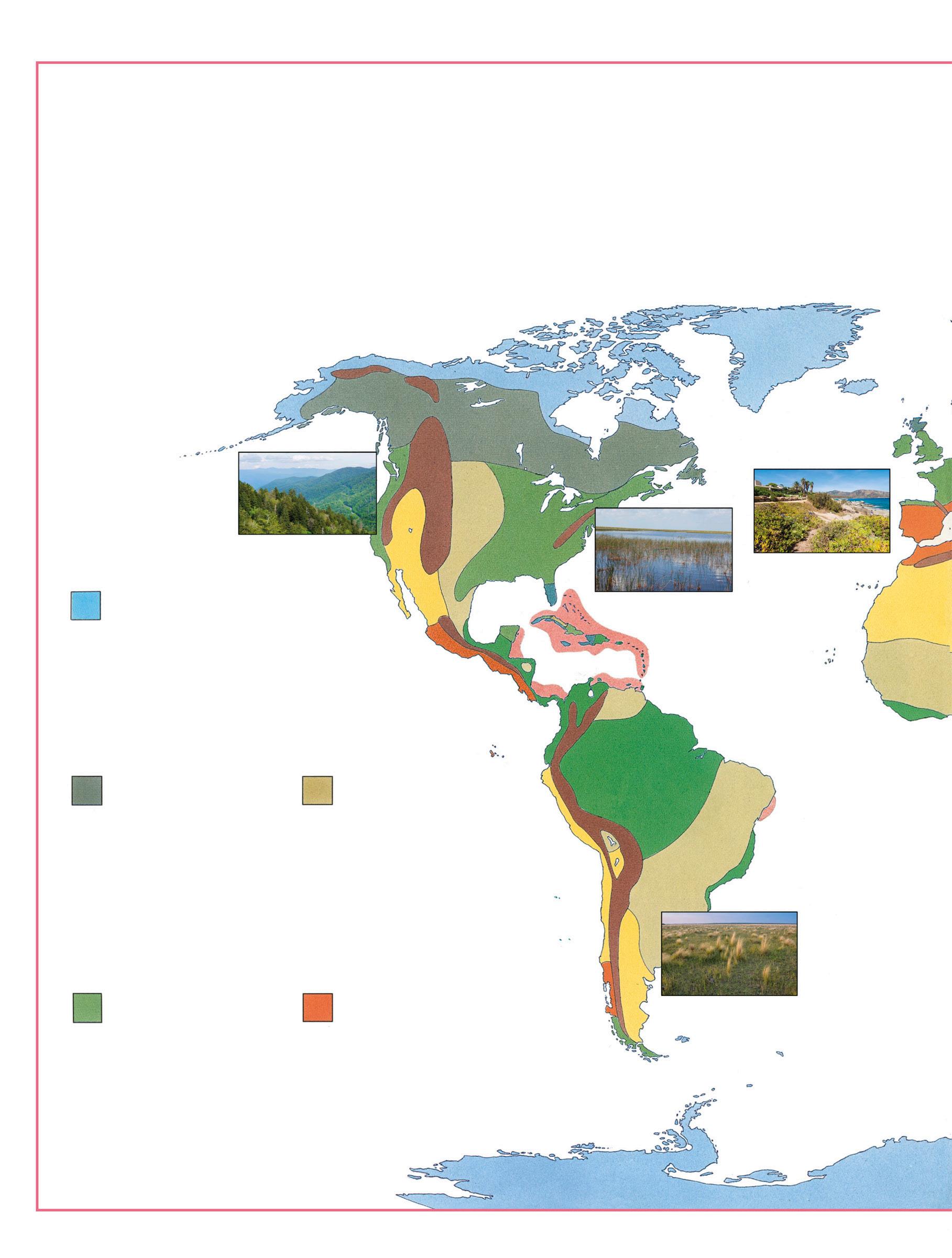 The map on these two pages shows the main types of habitats around the world. Animals have adapted to live in each of these habitats by developing characteristics that help them survive. Similar types of habitats can be found in different parts of the world, and the animals that live there have