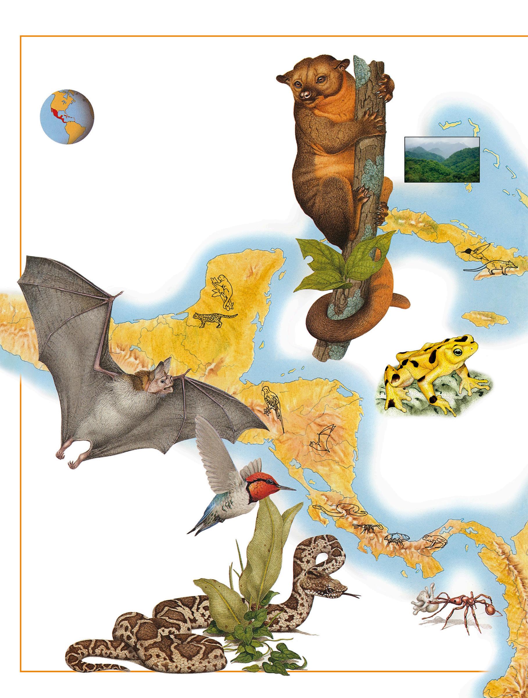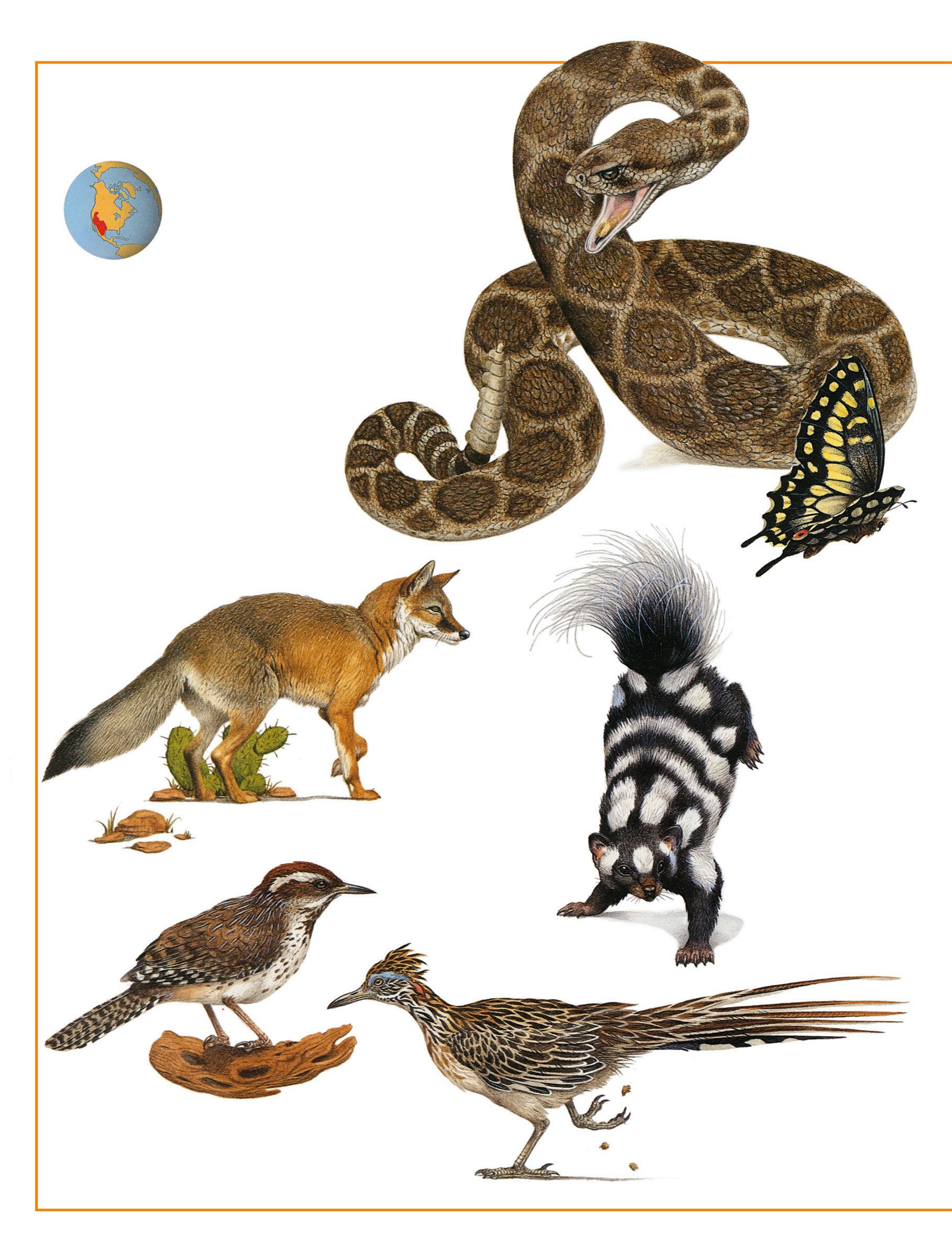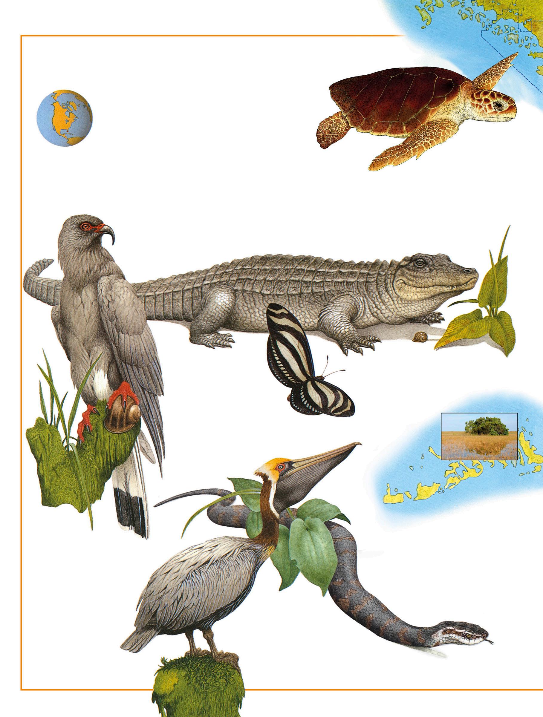 The map on these two pages shows the main types of habitats around the world. Animals have adapted to live in each of these habitats by developing characteristics that help them survive. Similar types of habitats can be found in different parts of the world, and the animals that live there have