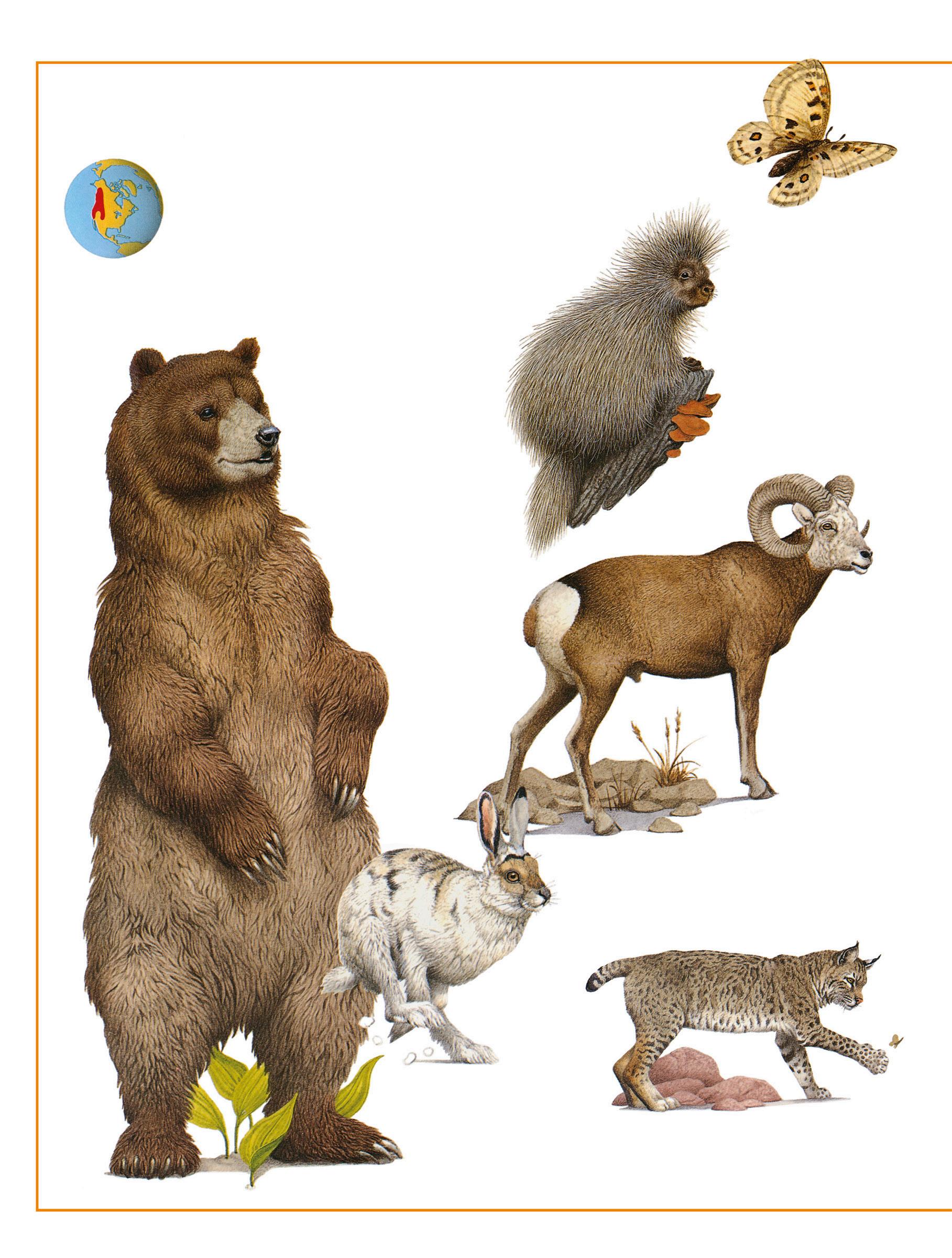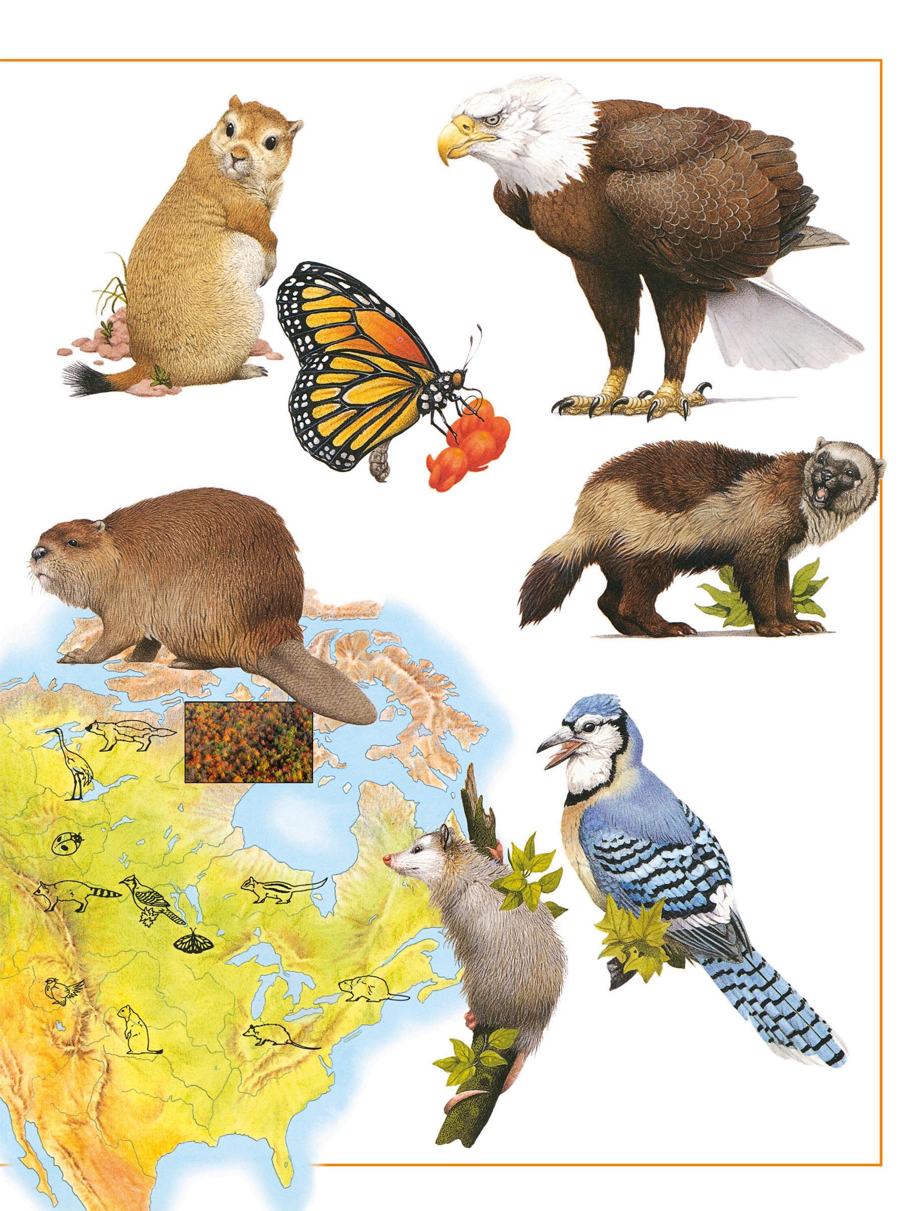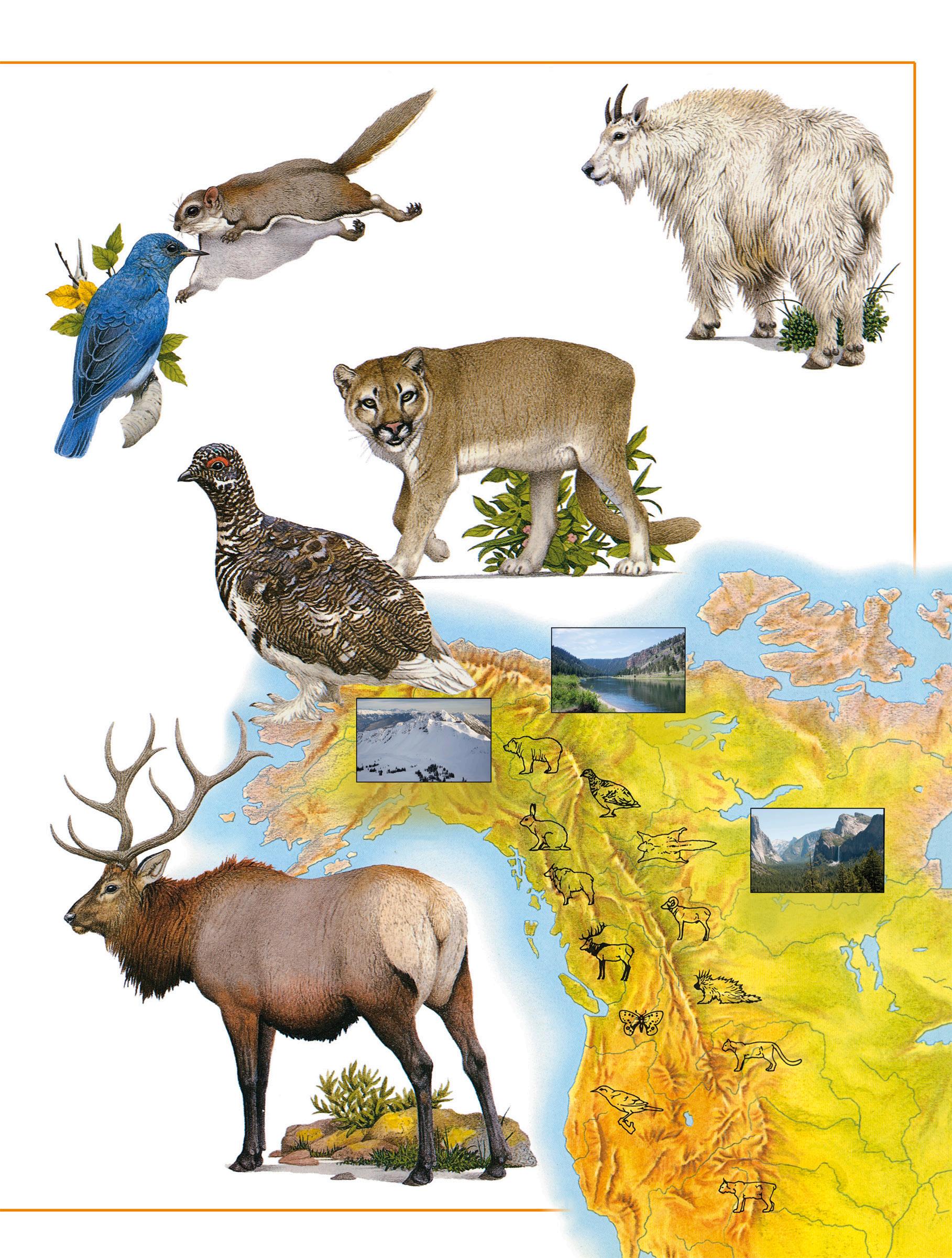 The animal symbols on the map show the main area where the animals can be found, but some animals are widely distributed over the whole region. There is one symbol for each of the animals illustrated on the spread.
