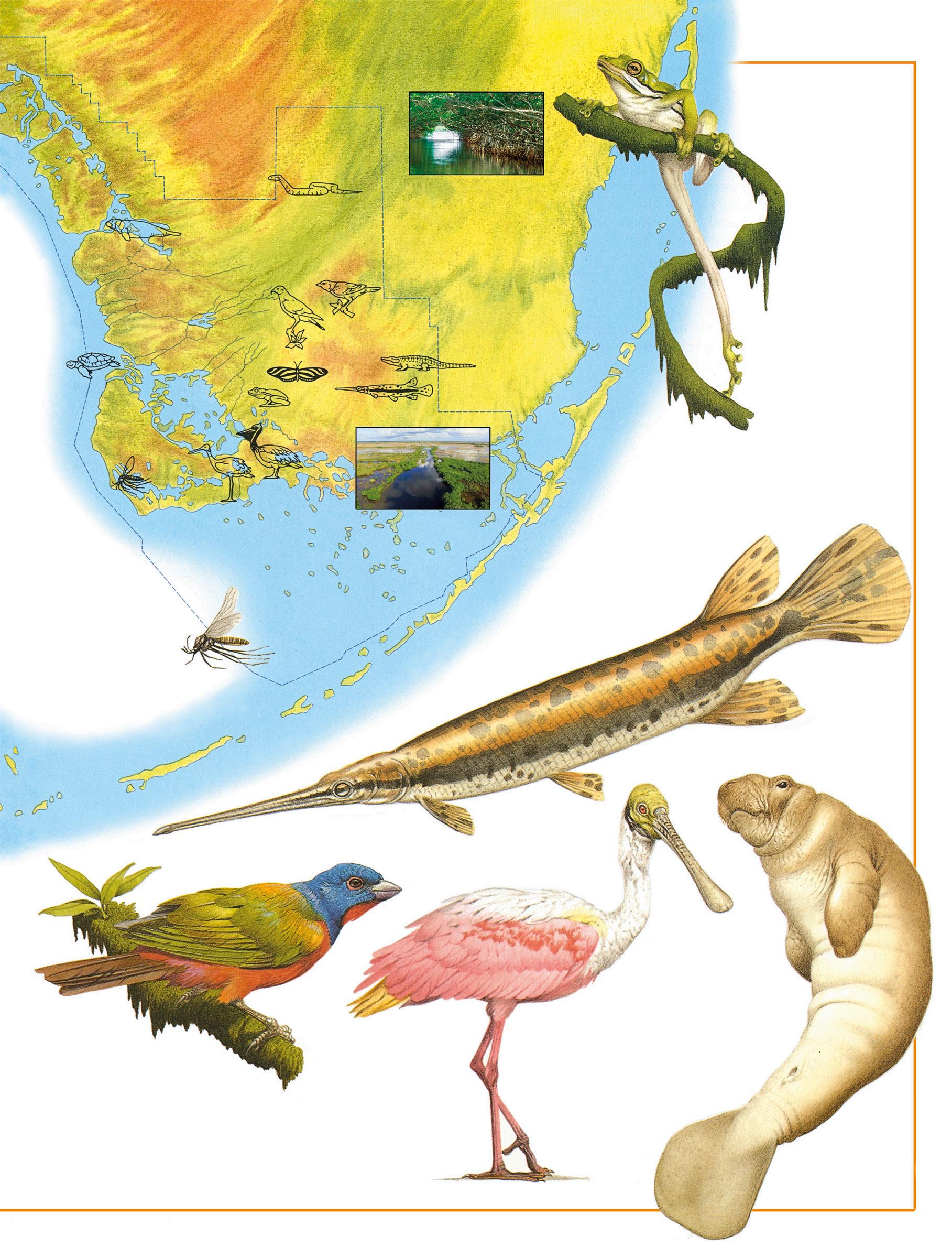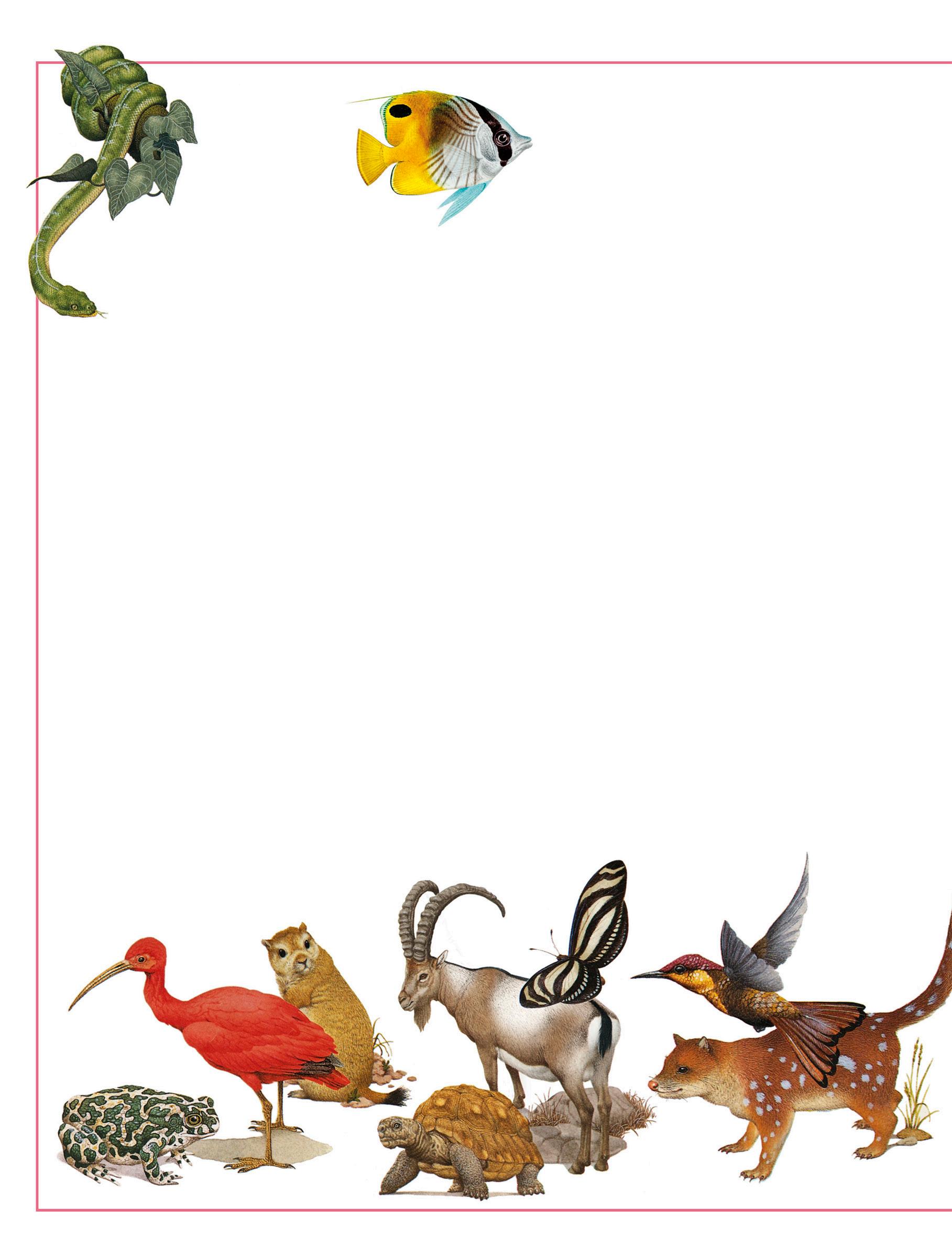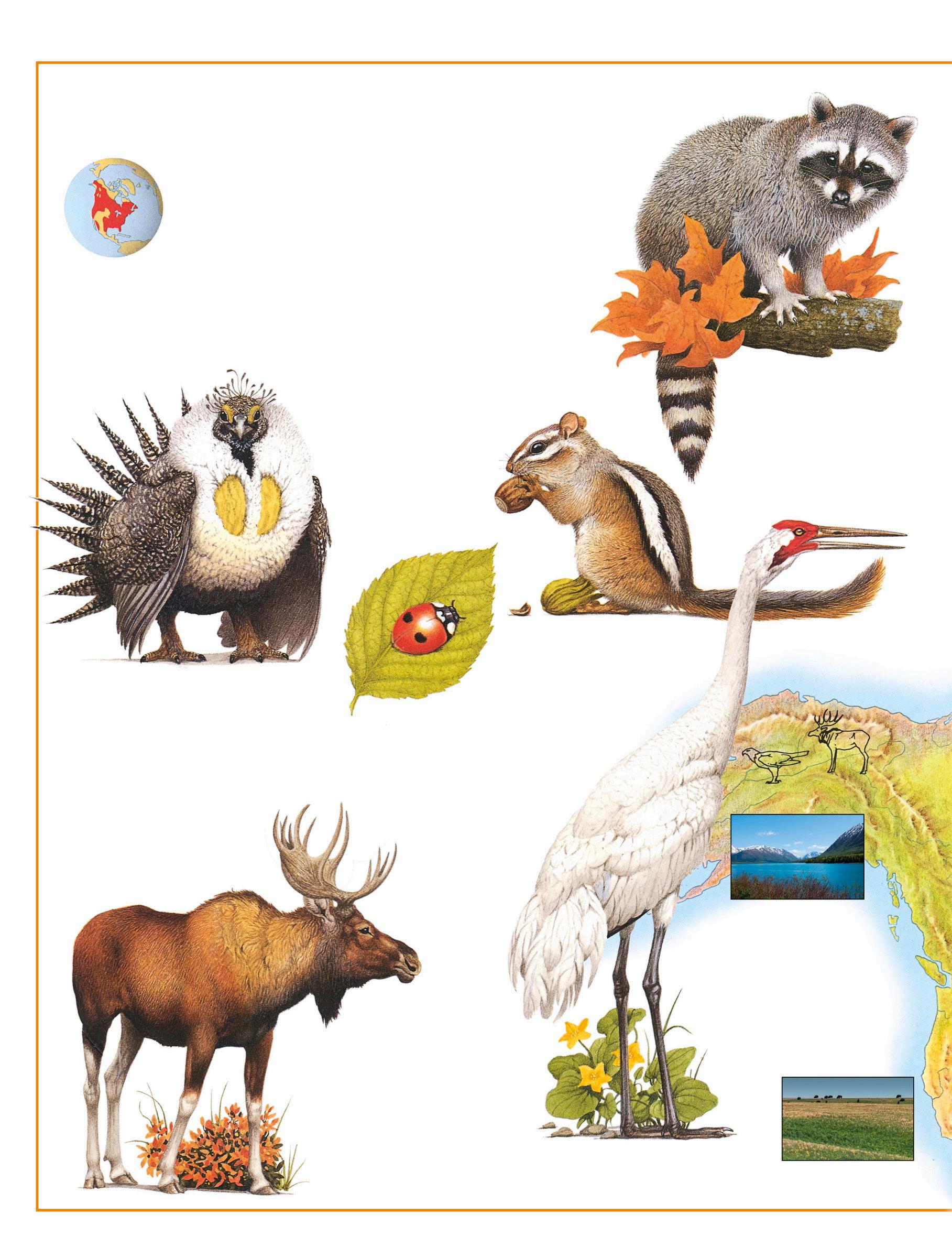 The animal symbols on the map show the main area where the animals can be found, but some animals are widely distributed over the whole region. There is one symbol for each of the animals illustrated on the spread.