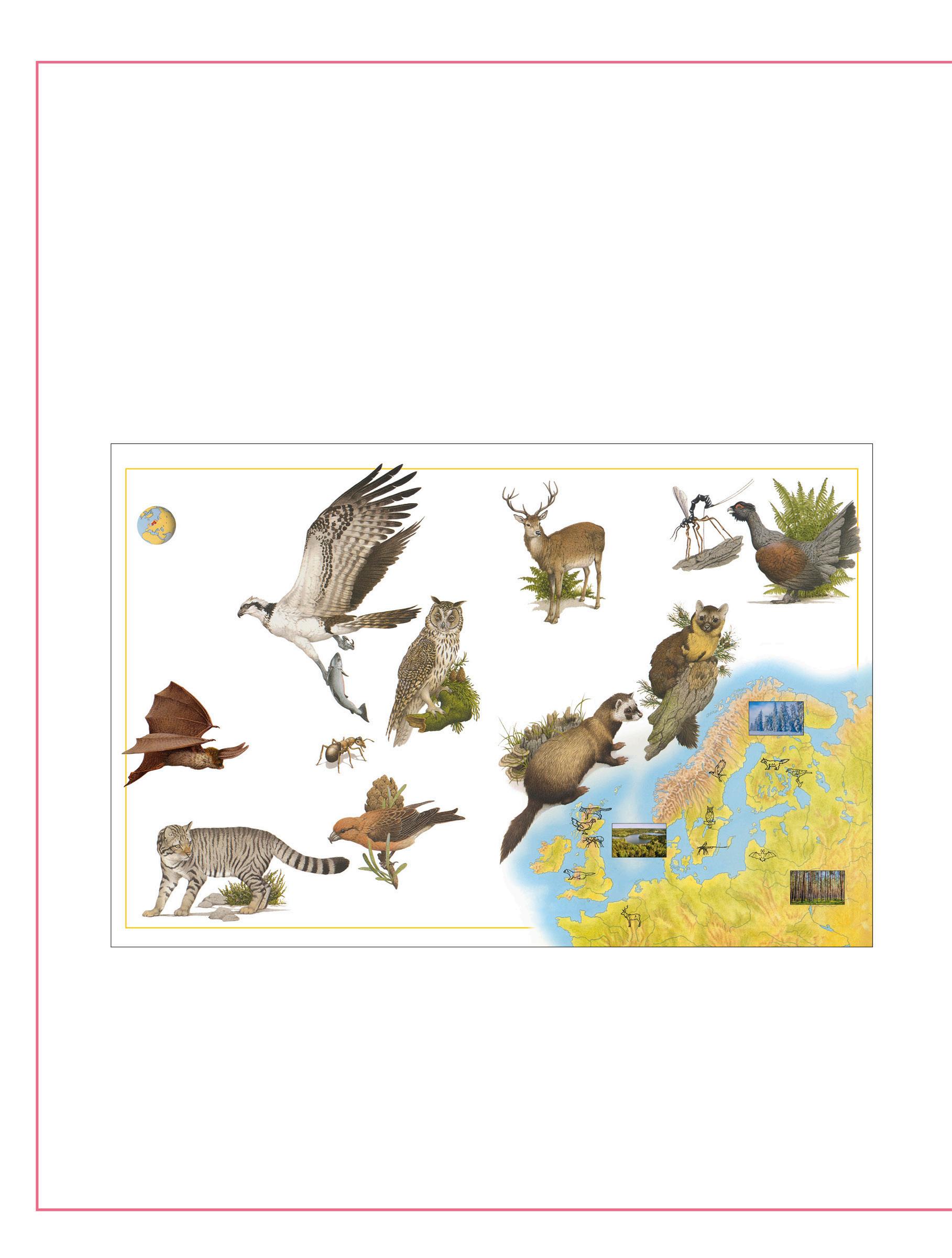 Each double-page spread in this atlas covers a particular type of habitat (the place where an animal lives). For example, the spread shown below is about European conifer forests. Habitats are arranged by continent, and there is a section in the book for each of
