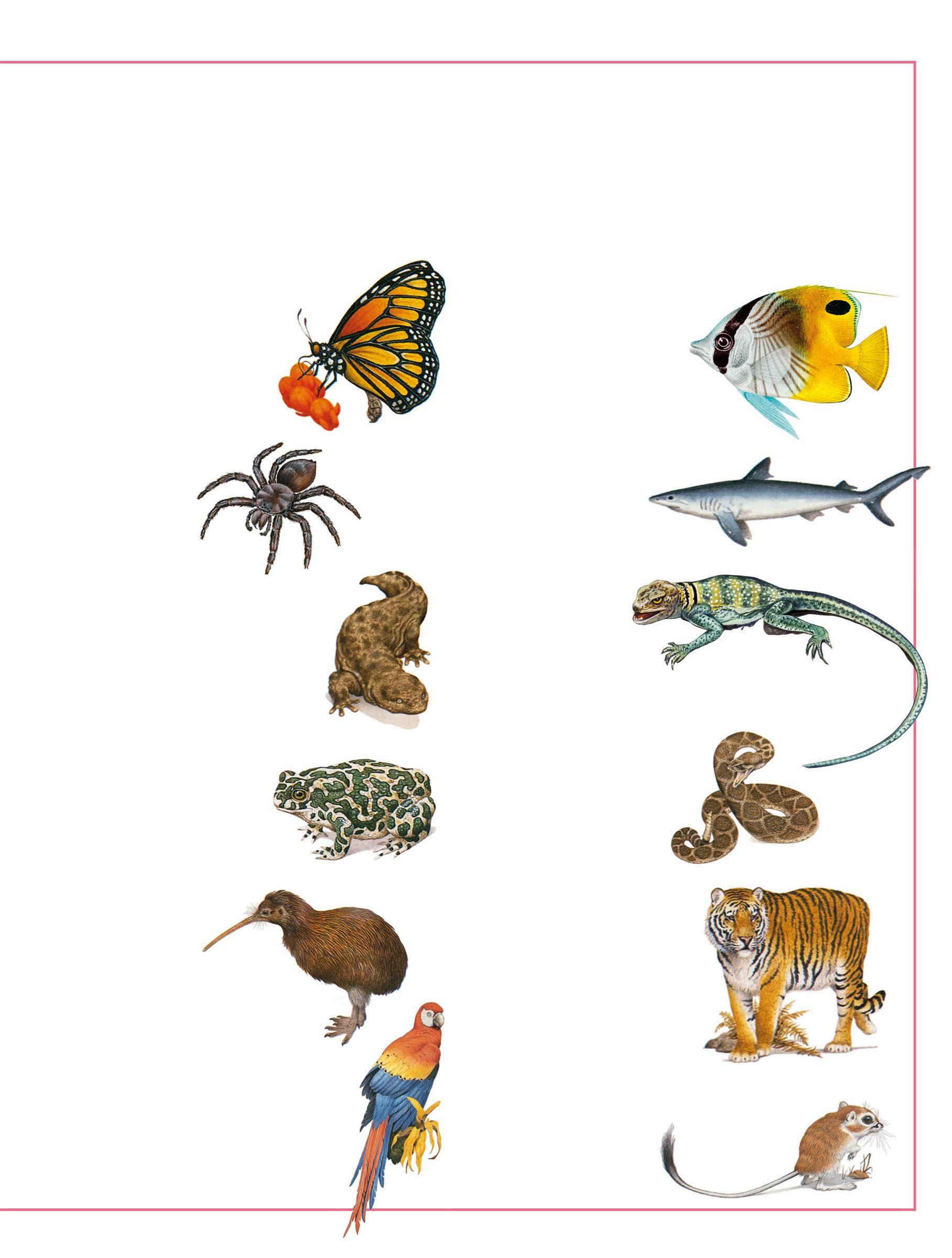 They move, breathe, feed, grow, have young, and respond to changes in their surroundings. To make animals easier to study, biologists divide them into a number of groups. The main groups are shown below.
