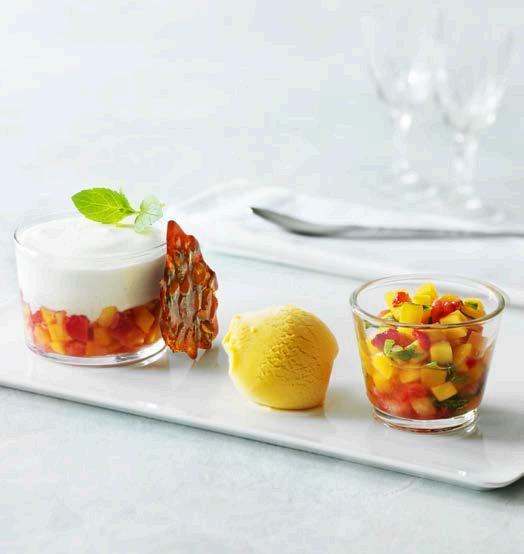 Fruit brunoise in gelei van Moscato d’Asti met panna cotta en mangosorbet