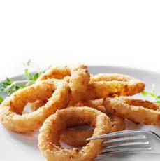 Met broodkruimels gepaneerde gelijkvormige ringen van uienstukjes (geëxtrudeerd). Héél krokant!