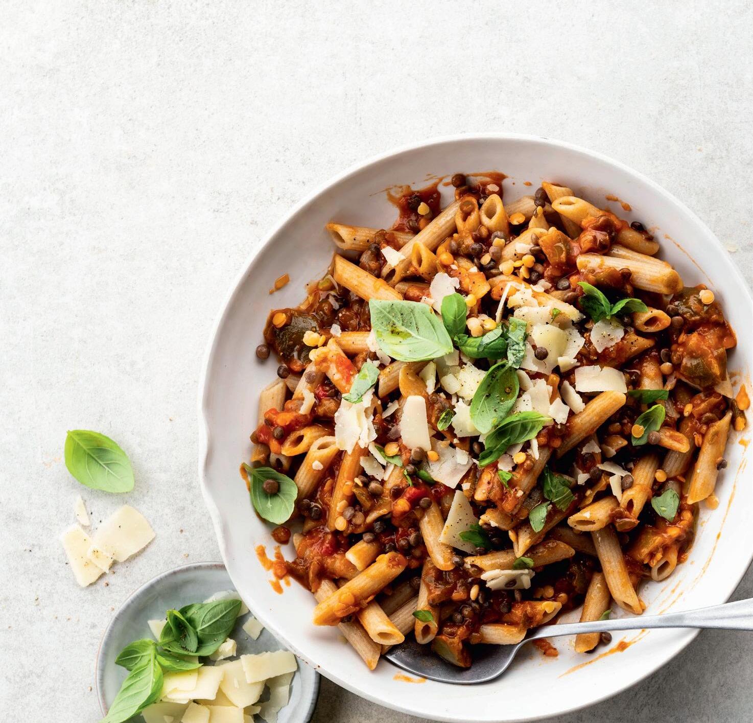 Diese Mischung ausveganen Penne, Ratatouille und Linsen ergibt eine vollwertige Mahlzeit