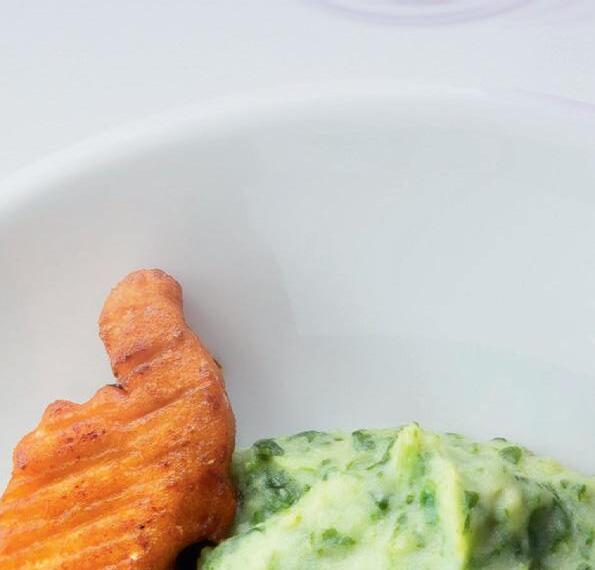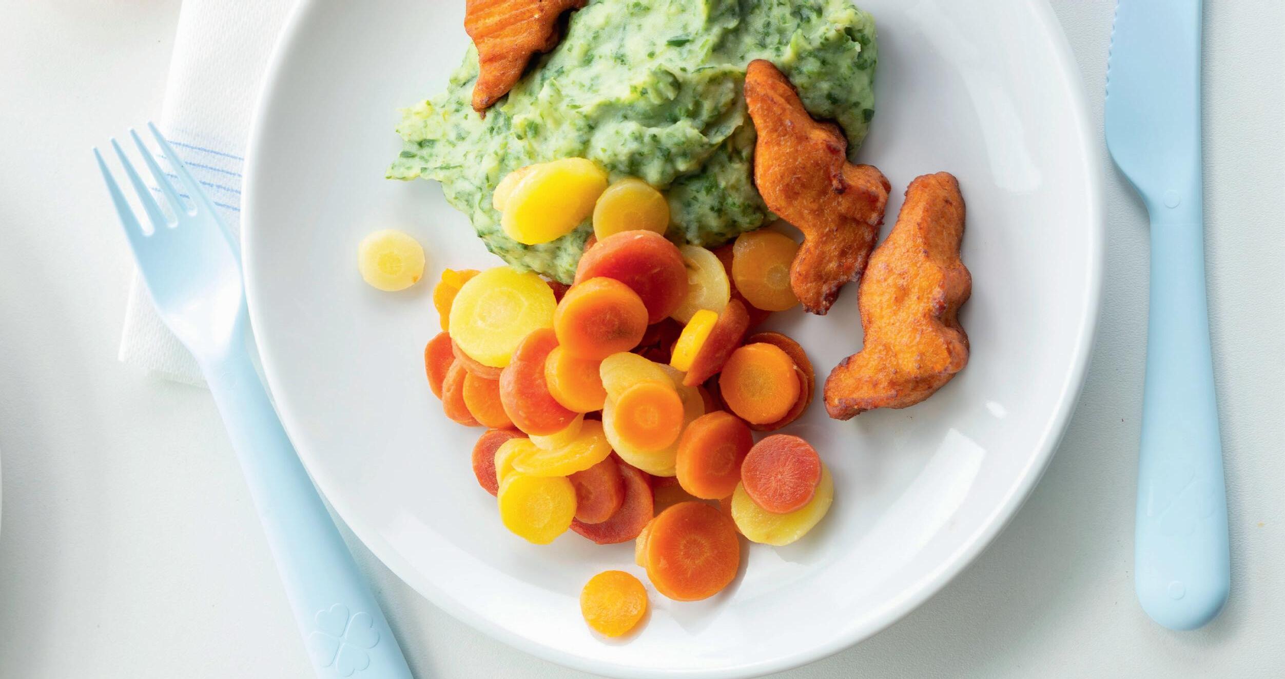 Dino-Nuggets mit Spinatpüree und bunten Regenbogenkarotten