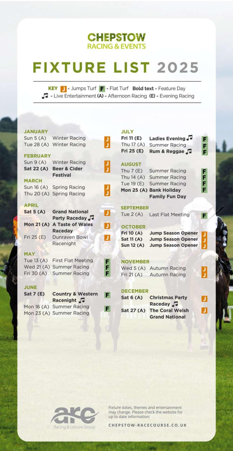 CHEPSTOW RACECOURSE is part of Arena Racing Company which includes; Bath, Brighton, Doncaster, Ffos Las, Fontwell Park, Great Yarmouth, Hereford, Lingfield Park, Newcastle, Royal Windsor, Sedgefield, Southwell, Uttoxeter, Wolverhampton and Worcester racecourses