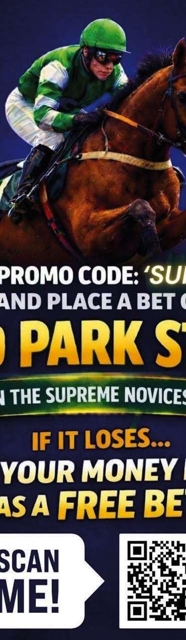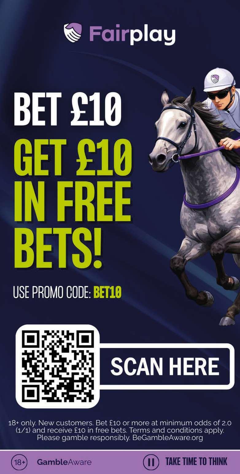 First Race 1.42 - THE fairplaybet.co.uk CONDITIONAL JOCKEYS’ HANDICAP HURDLE RACE (CLASS 5) Distributed in accordance with the Stakes and Prize Money Code £3696 to the winning horse The second to receive £1701, the third £850, the fourth £425 and the fifth £212. for four yrs old and upwards, Rated 0-100. Enter by noon, March 2nd and pay £35 stake, Declare by 10.00 a.m. March 5th. Penalties, after February 28th, 2026, for each hurdle race won 7lb To be ridden by Conditional Jockeys, Overseas Jockeys eligible under Rule (B)42 and Professional Jockeys eligible to claim a weight allowance under paragraph 53 of the Weights and Handicapping Code Allowances: Jockeys who, prior to March 4th, 2026, have not ridden more than 20 such winners 3lb Jockeys who have not ridden more than 10 such winners 5lb Jockeys who have not ridden more than 5 such winners 7lb (Only one of these allowances may be claimed and wins in any races run under the Rules of Racing or the Rules of a recognised Racing Authority will count) Jockeys riding for their own stables allowed, in addition 3lb Fairplaybet.co.uk have kindly sponsored this race and will present a winning memento to the winning owner In addition, they will present a prize to the person who, in their opinion, is responsible for the horse judged to be the best turned out. 13 entries at £35. - Closed March 2nd, 2026. Owners Prize Money. Winner £2827; Second £1413; Third £707; Fourth £354; Fifth £176. (Penalty Value £3696.70) A SEE PAGE 10 FOR THIS RACE