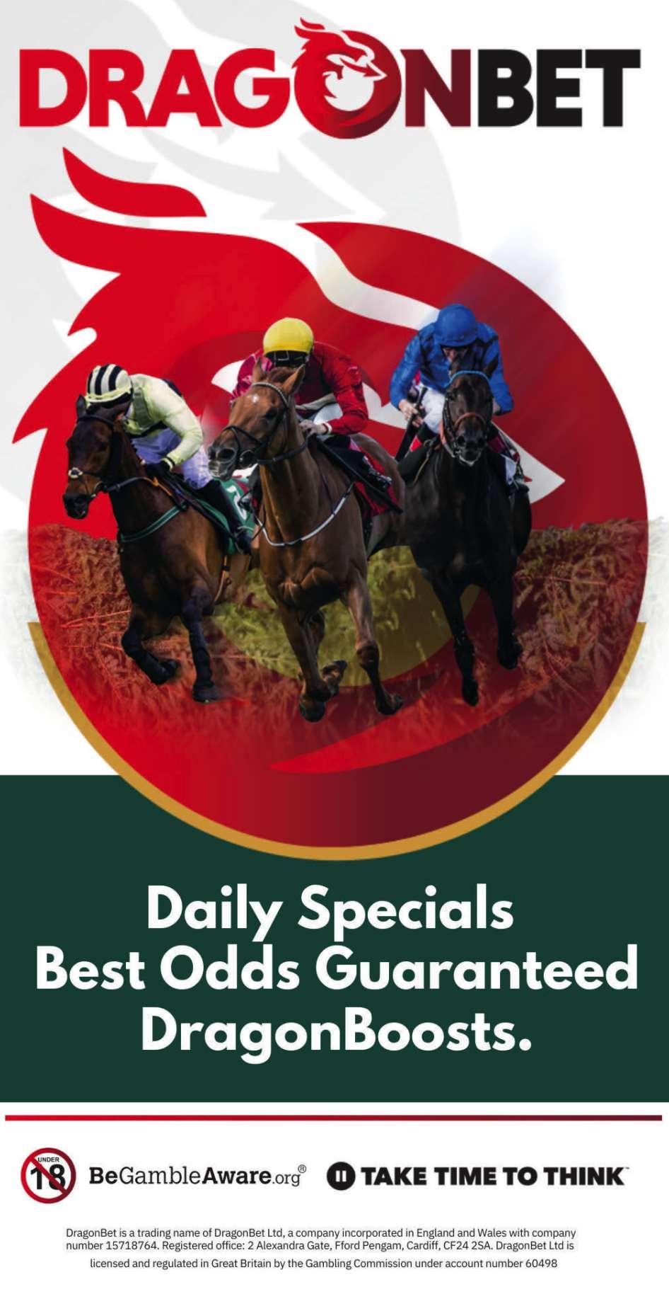 Fourth Race 3.40 - THE DRAGONBET CHELTENHAM INFERNOBOOSTS BACK FOR ROAR MAIDEN HURDLE RACE (CLASS 4) (GBB RACE) Distributed in accordance with the Stakes and Prize Money Code £5446 to the winning horse The second to receive £2509, the third £1254 and the fourth £628. for maiden four yrs old and upwards. Enter by noon, February 16th and pay £50 stake, Declare by 10.00 a.m. February 20th. Weights: 4-y-o 10st 4lb; 5-y-o and up 11st 4lb Fillies and mares allowed 7lb No allowance to take a Horse’s weight below 10st 2lb DragonBet have kindly sponsored this race and will present a momento to the winning owner The will also give a prize to the person who, in their opinion, is responsible for the best turned out horse in this race 17 entries at £50. - Closed February 16th, 2026. Owners Prize Money. Winner £4173; Second £2087; Third £1043; Fourth £522. (Penalty Value £5446)