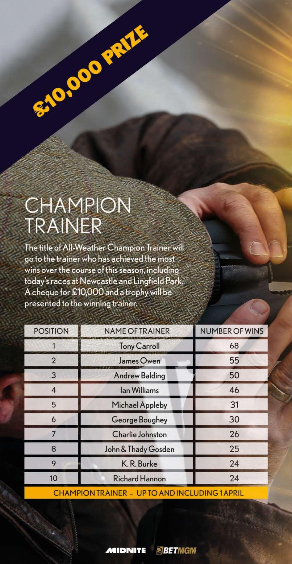 Our thanks go to all owners, trainers and racing staff, including those who have travelled from overseas, for supporting us today and throughout the All-Weather season, and our congratulations to this season’s All-Star Champions: Champion Jockey Billy Loughnane, Champion Owner Godolphin, and Champion Trainer Tony Carroll. The Champion Apprentice title is set for a thrilling conclusion today, with Ryan Kavanagh narrowly ahead of Jack Callan, who rides in seven races here today.