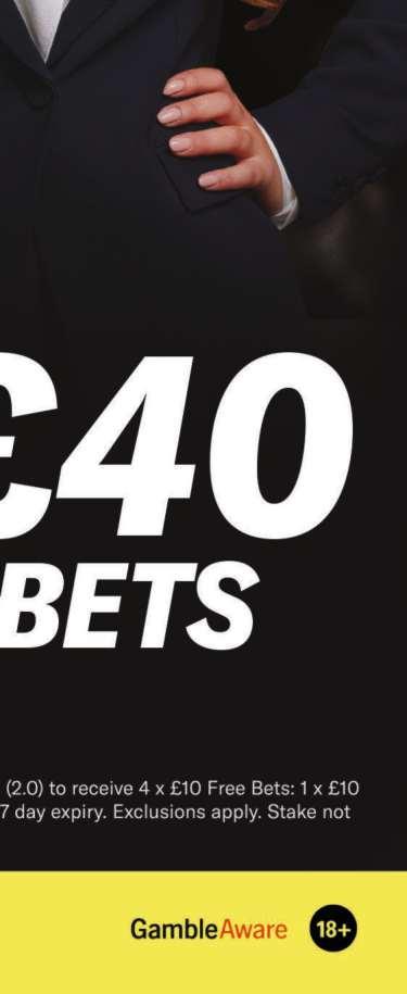 First Race 4.20 - THE WIN £1M WITH BETMGM’S GOLDEN GOALS NOVICE STAKES (CLASS 5) (for horses which have run no more than three times) ( (GBB RACE) Distributed in accordance with the Stakes and Prize Money Code. £3402 to the winning horse The second to receive £1597, the third £798 and the fourth £399. for novice two yrs old, which have run no more than three times. Enter by noon, October 18th and pay £31 stake, Declare by 10.00 a.m. October 22nd. Weights: Colts and geldings 9st 4lb; fillies 8st 13lb Penalties, for each Restricted Novice or Maiden race won 4lb For each other race won 7lb (Sellers and Claimers excluded for the purposes of penalties). BetMGM has kindly sponsored this race and will provide the person responsible for the horse judged to be the best turned out with £25. 15 entries at £31. - Closed October 18th, 2024. Owners Prize Money. Winner £2688; Second £1344; Third £672; Fourth £336. (Penalty Value £3402) SS SEE PAGE 6 FOR THIS RACE.