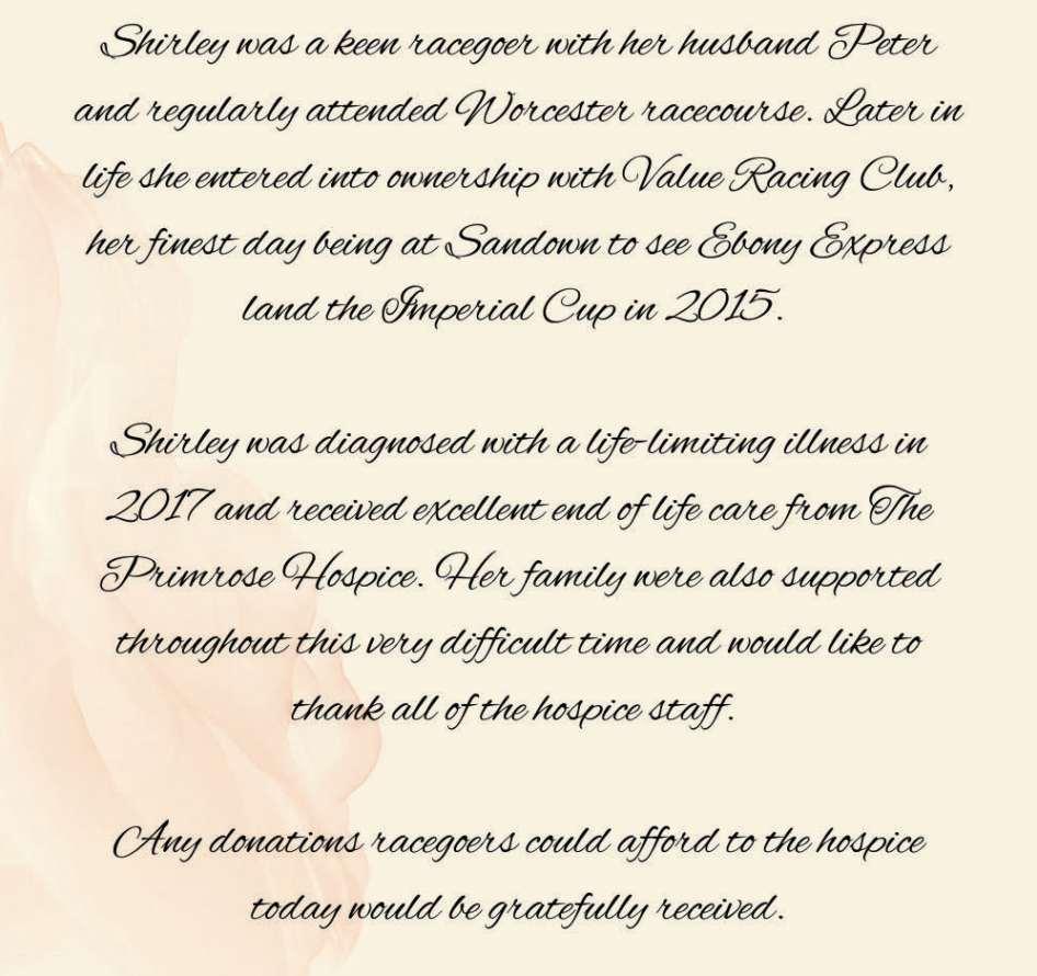 Third Race 2.05 THE RICHARD WRIGHT MEMORIAL HANDICAP STEEPLE CHASE (CLASS 3) Distributed in accordance with the Stakes and Prize Money Code. £10892 to the winning horse The second to receive £5018, the third £2508, the fourth £1256, the fifth £350, the sixth £350, the seventh £350 and the eighth £350. for four yrs old and upwards, Rated 0-130 (also open to such horses rated 131 and 132 see Standard Conditions) £100 stake if the horse is rated 104 or higher, or £20 stake if the horse is rated 103 or lower with £80 extra if the horse is declared to run Declare by 10.00 a.m. October 17th Penalties, after October 8th, 2022, for each steeple chase won 7lb. The family of Richard Wright have kindly sponsored this race and will present a memento to the winning owner. In addition, they will give a prize to the person who, in their opinion, is responsible for the horse judged to be the best turned out in this race. 13 entries at £100 Closed October 13th, 2022. Owners Prize Money. Winner £8346; Second £4174; Third £2086; Fourth £1044; Fifth £280; Sixth £280; Seventh £280; Eighth £280. (Penalty Value £10892)