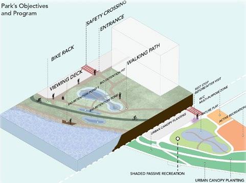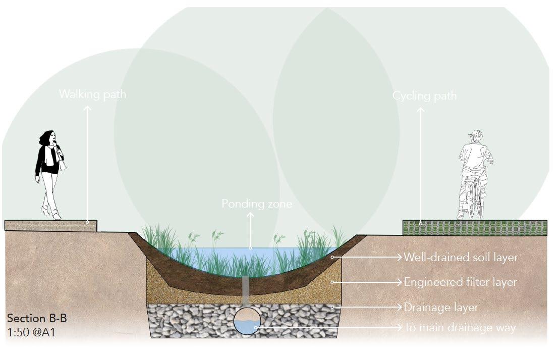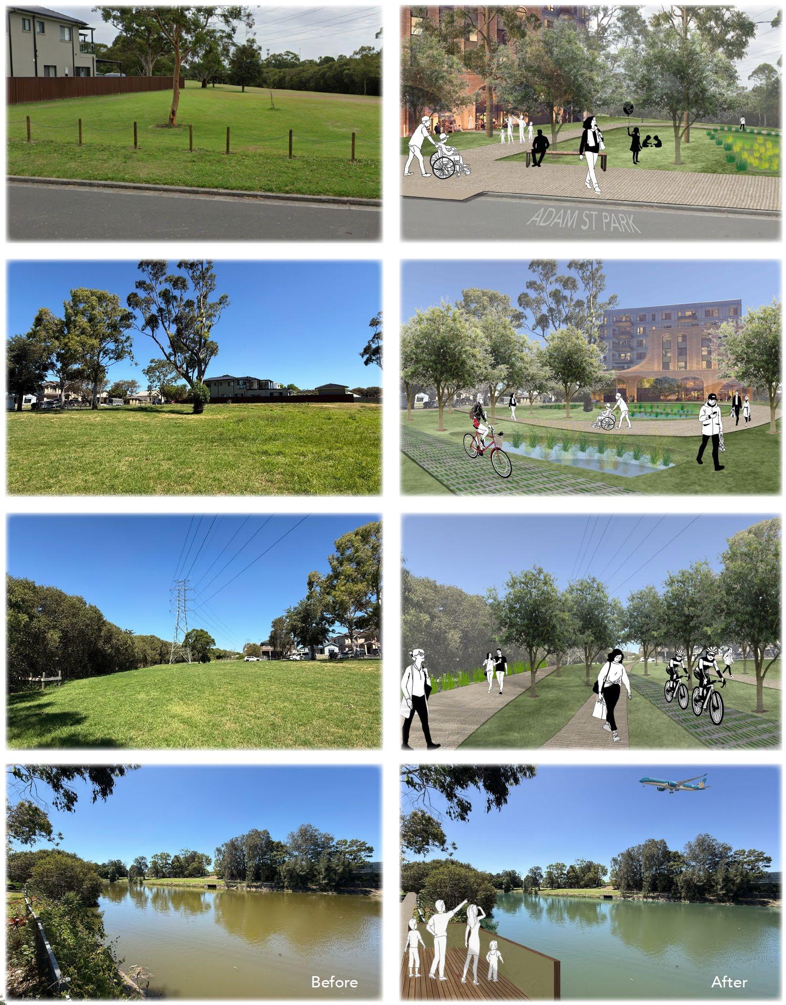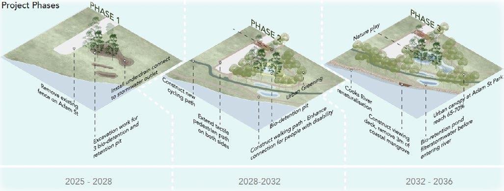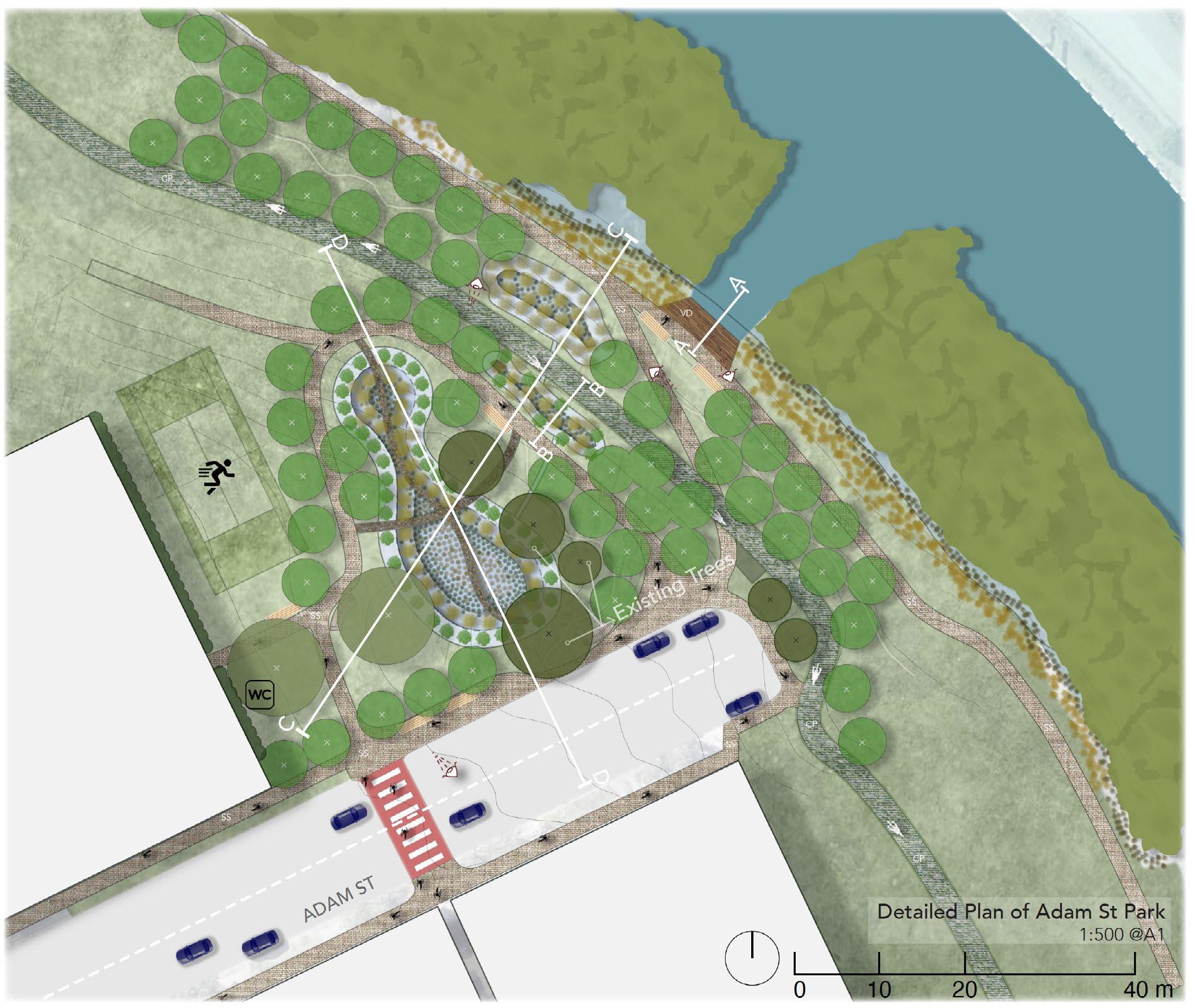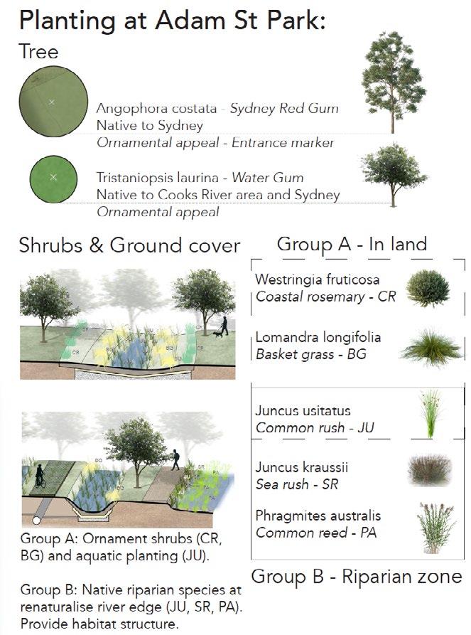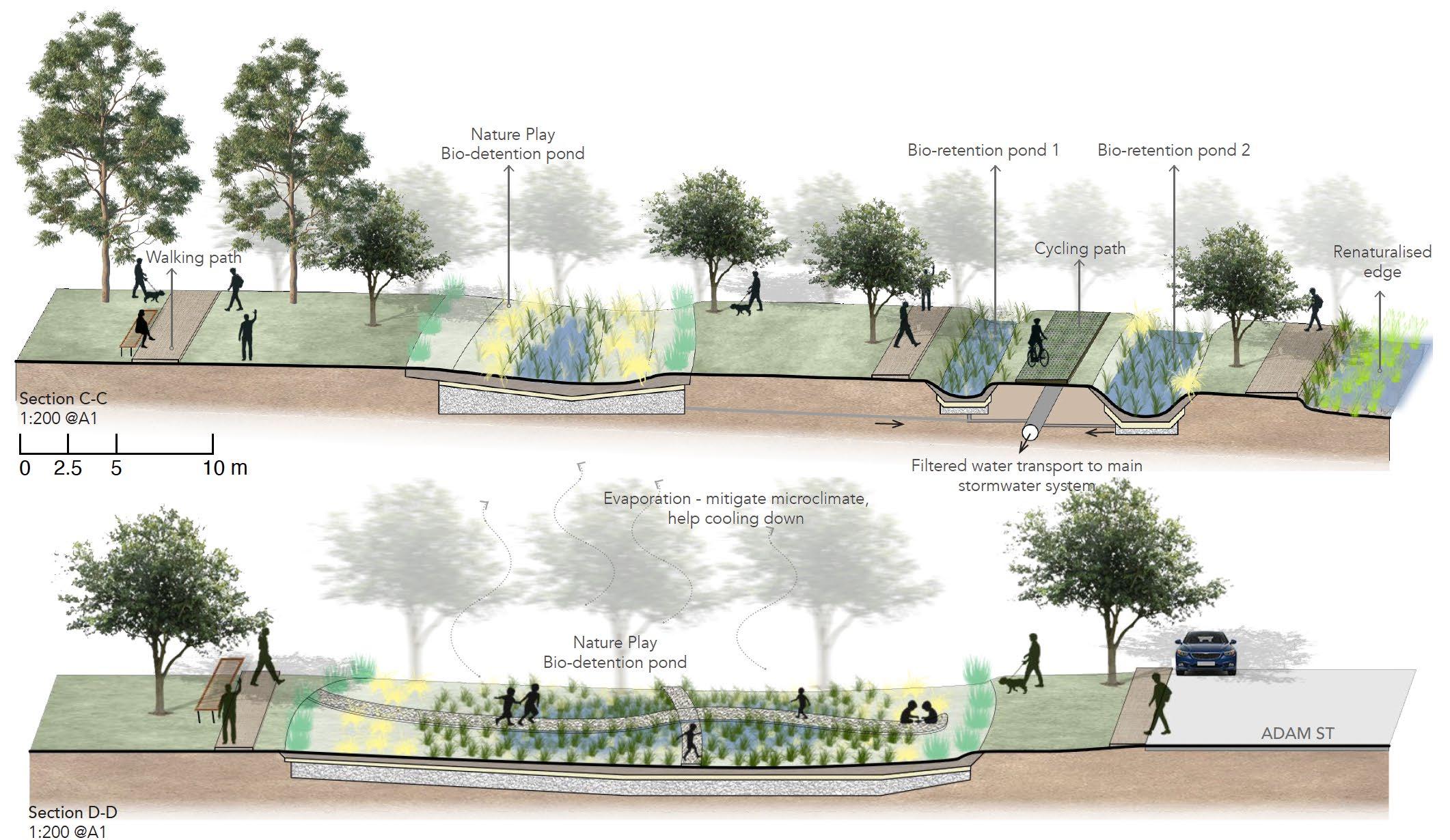 The Adam Street Park is envisioned to transform Campsie waterfront precinct into a water sensitive and inclusive place. The core objectives are enhanced accessibility and water sensitivity. New paths for walking and cycling will be constructed to create a sense of place for all ages and abilities can enjoy the water front. Simultaneously, WSUD features three bio-retention ponds, each with a different program to increase versatility. These ponds will naturally manage storm water, foster a healthier Cooks River and become a model of resilience landscape, mitigating the impact of intense rainfall events due to climate change, foster a healthier river through restoring native riparian habitat, enhance biodiversity quality of life for the community