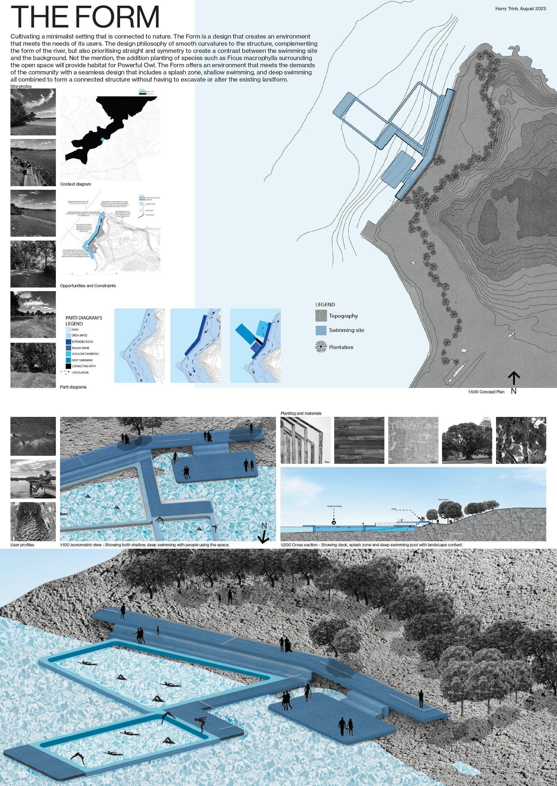 Landscape Studio 1 - The first studio experience that set the curve for my design standard. The first project was an open riverside swimming spot in Callan Park, Sydney. The constraint here was frequently tidal rising, which the design has to be mindful towards the course of nature and human uses.