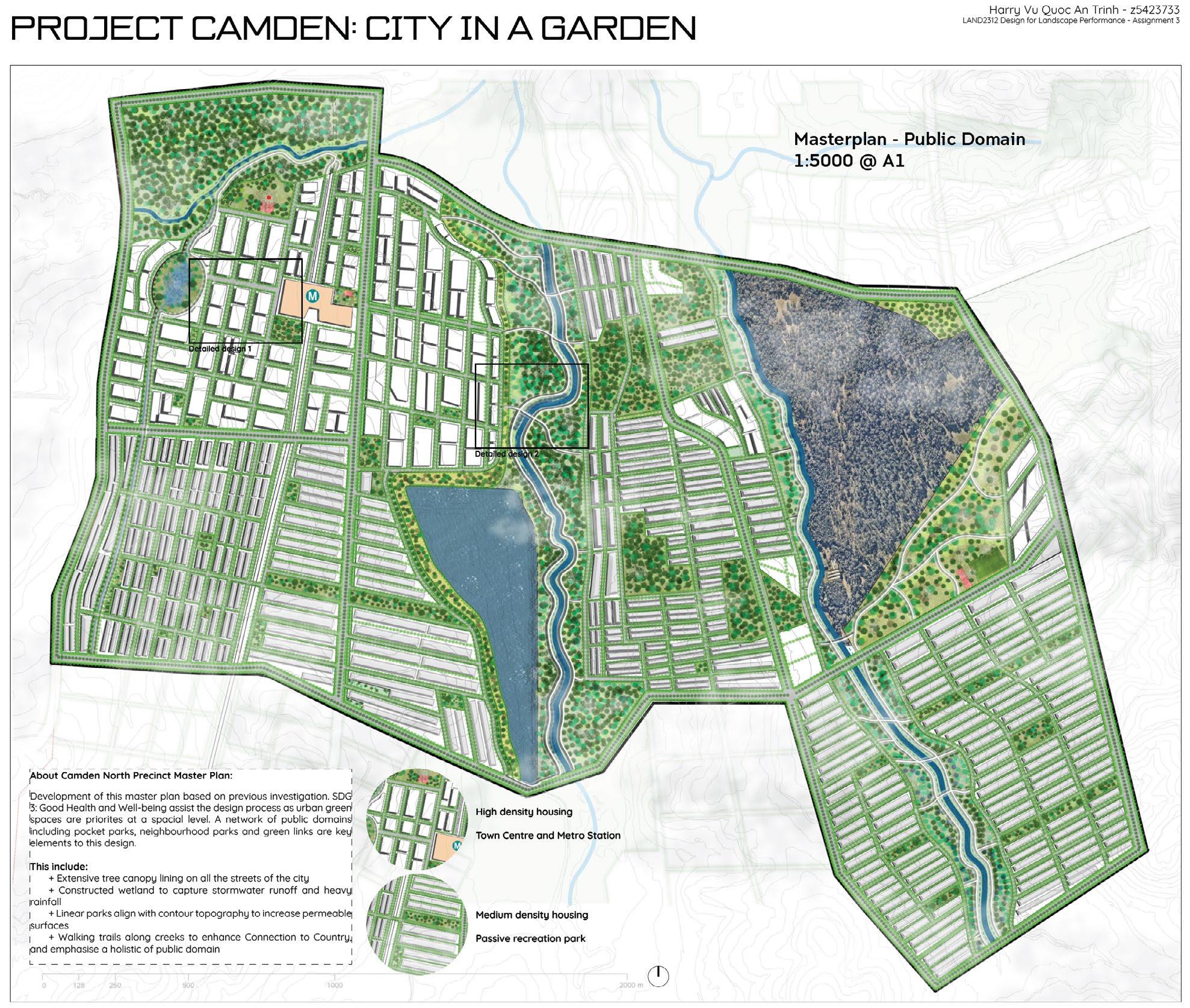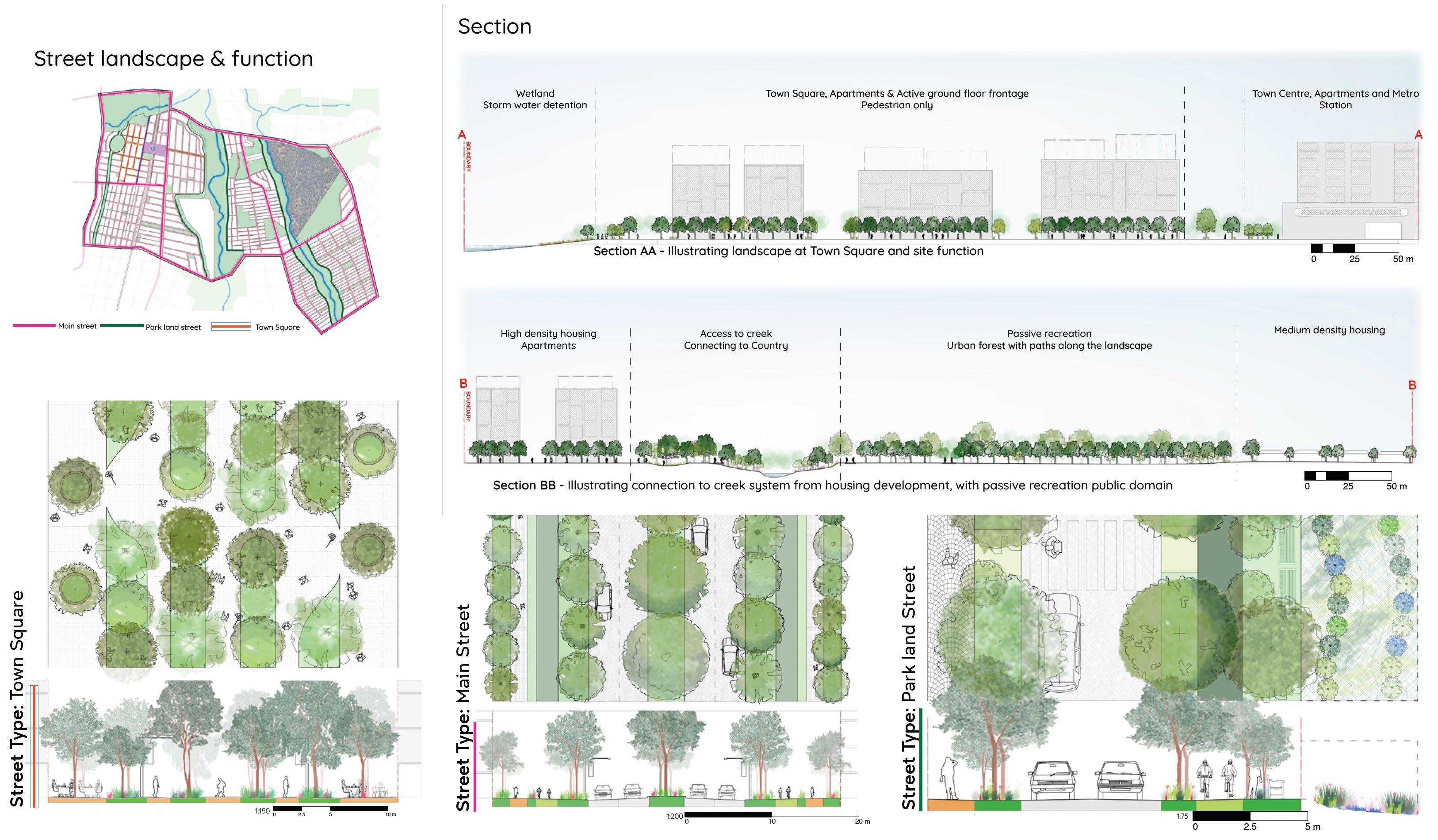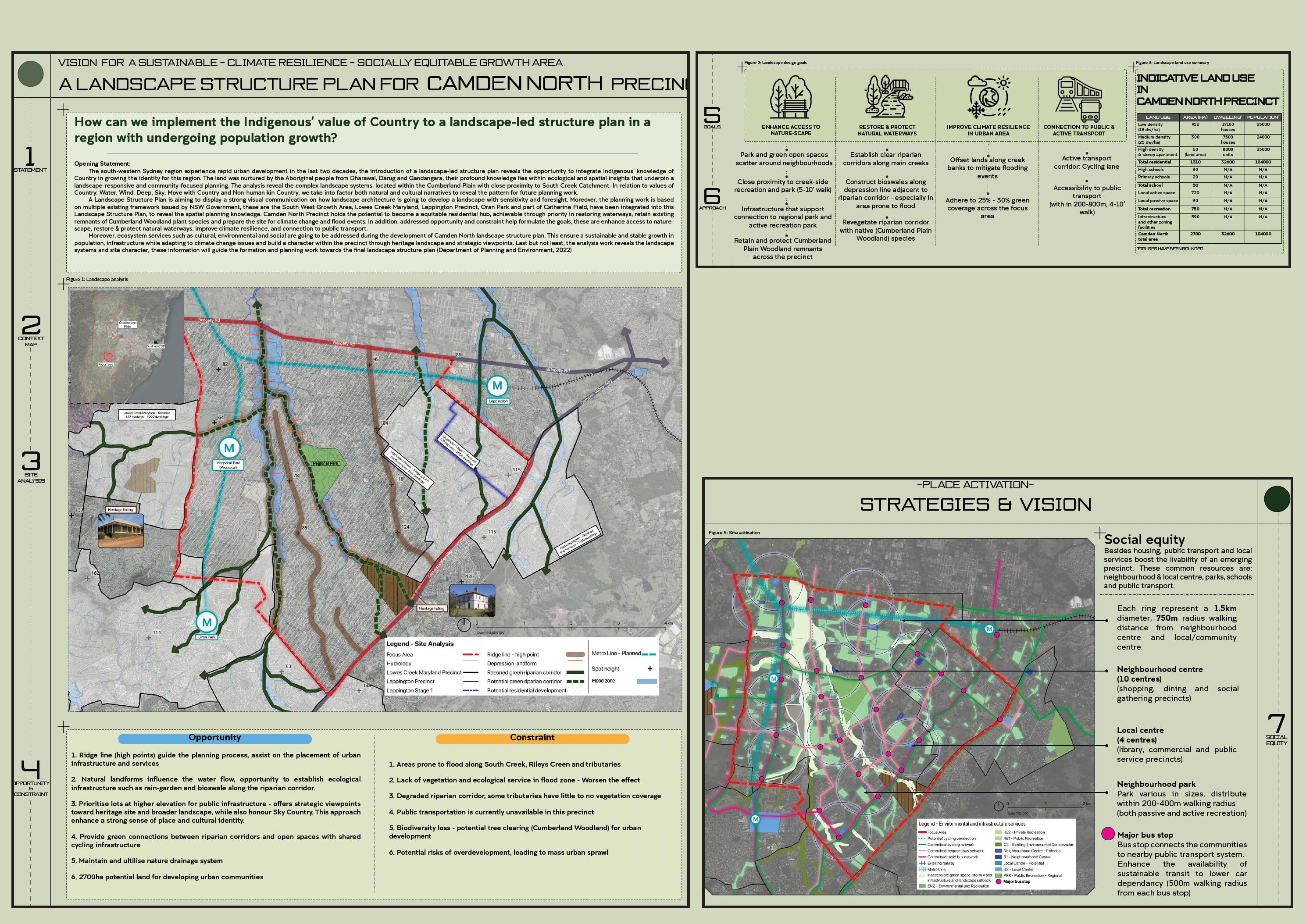 Landscape Studio 6 master plan adopt the structure plan from Studio 5. This chosen area is within the Camden North Precinct. The master plan visualise detailed design for Camden. Graphic work aim to convey TOD precinct; flood through nature-based water sensitive design and urban heat island mitigation through street planting, pocket parks and regional park.