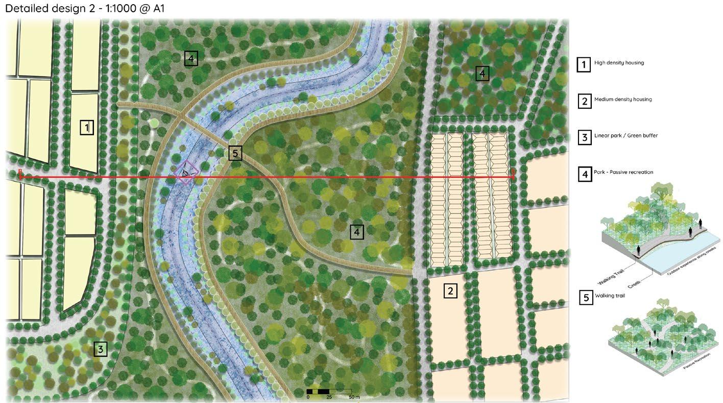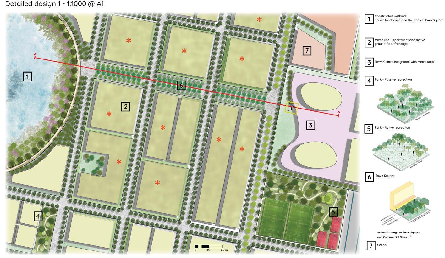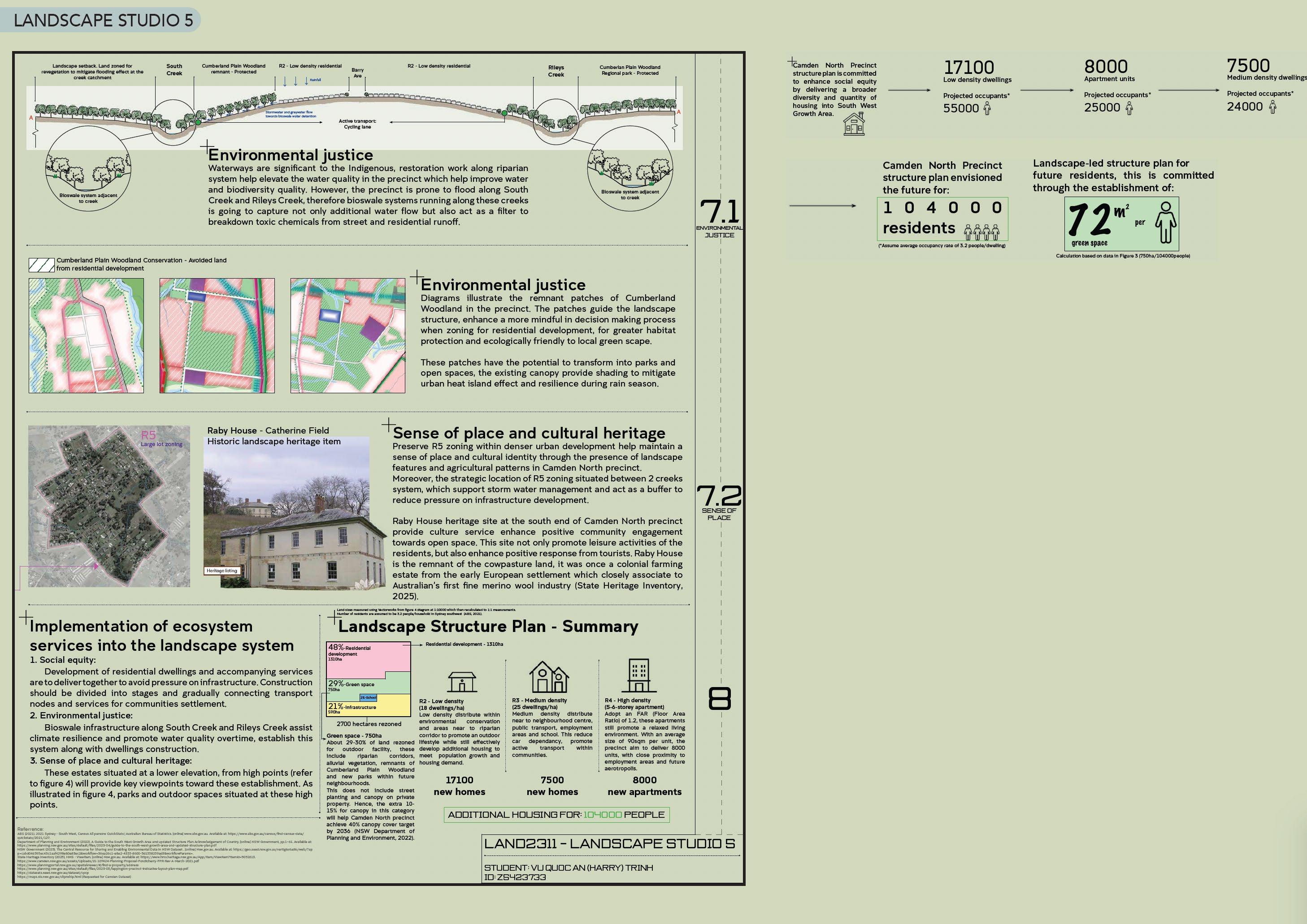 Landscape Studio 6 master plan adopt the structure plan from Studio 5. This chosen area is within the Camden North Precinct. The master plan visualise detailed design for Camden. Graphic work aim to convey TOD precinct; flood through nature-based water sensitive design and urban heat island mitigation through street planting, pocket parks and regional park.