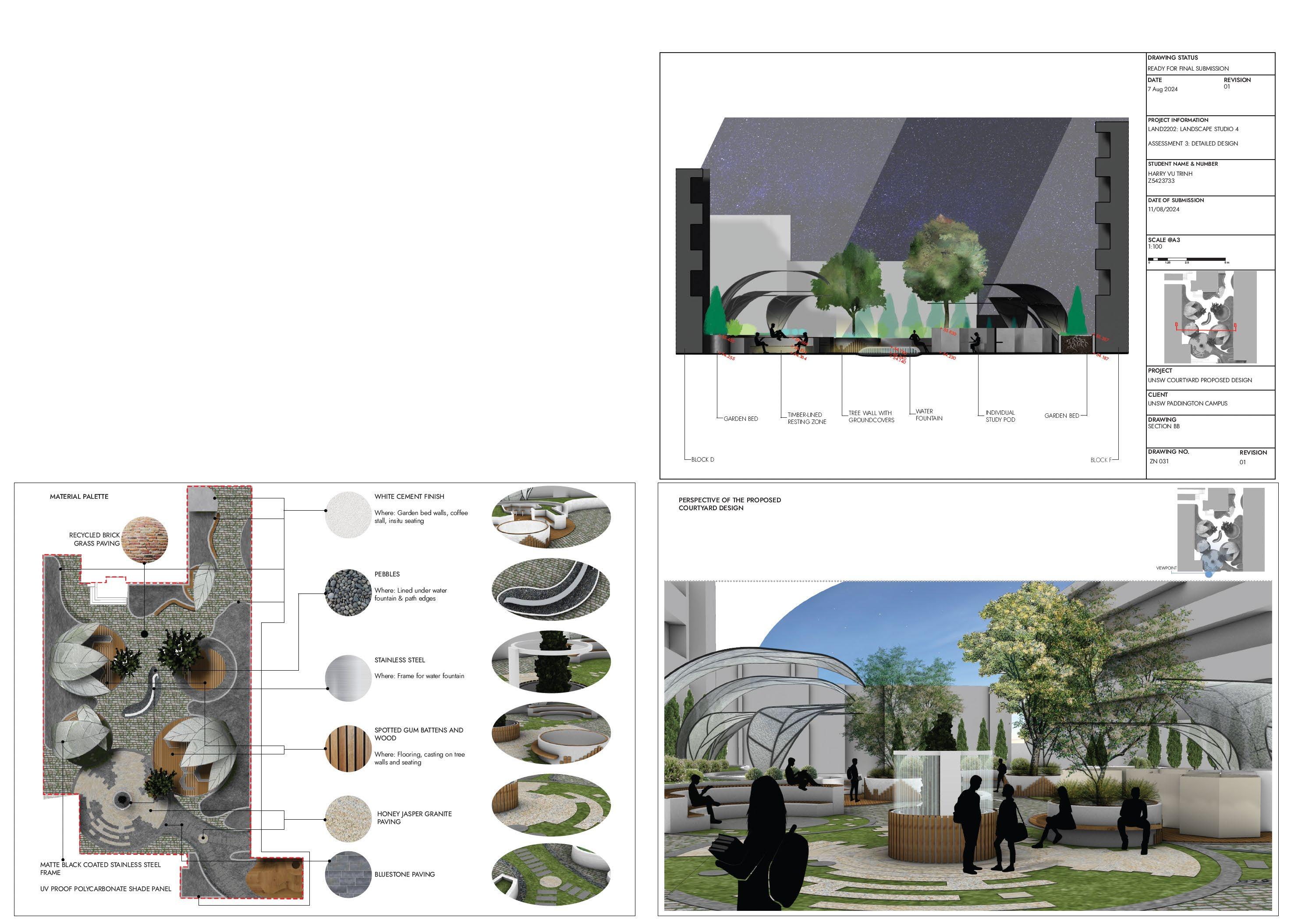 Landscape Studio 4 is a design project for UNSW Paddington courtyard. The main design language prioritise sound sensory experience, with more planting to cool down the surface temperature of existing courtyard. Redesigned courtyard form a sense of place, invite students and local residents to stay and interact with the landscape.