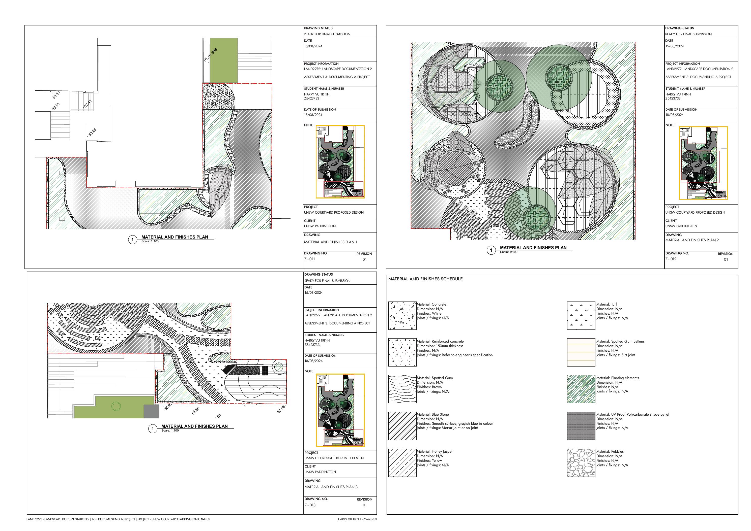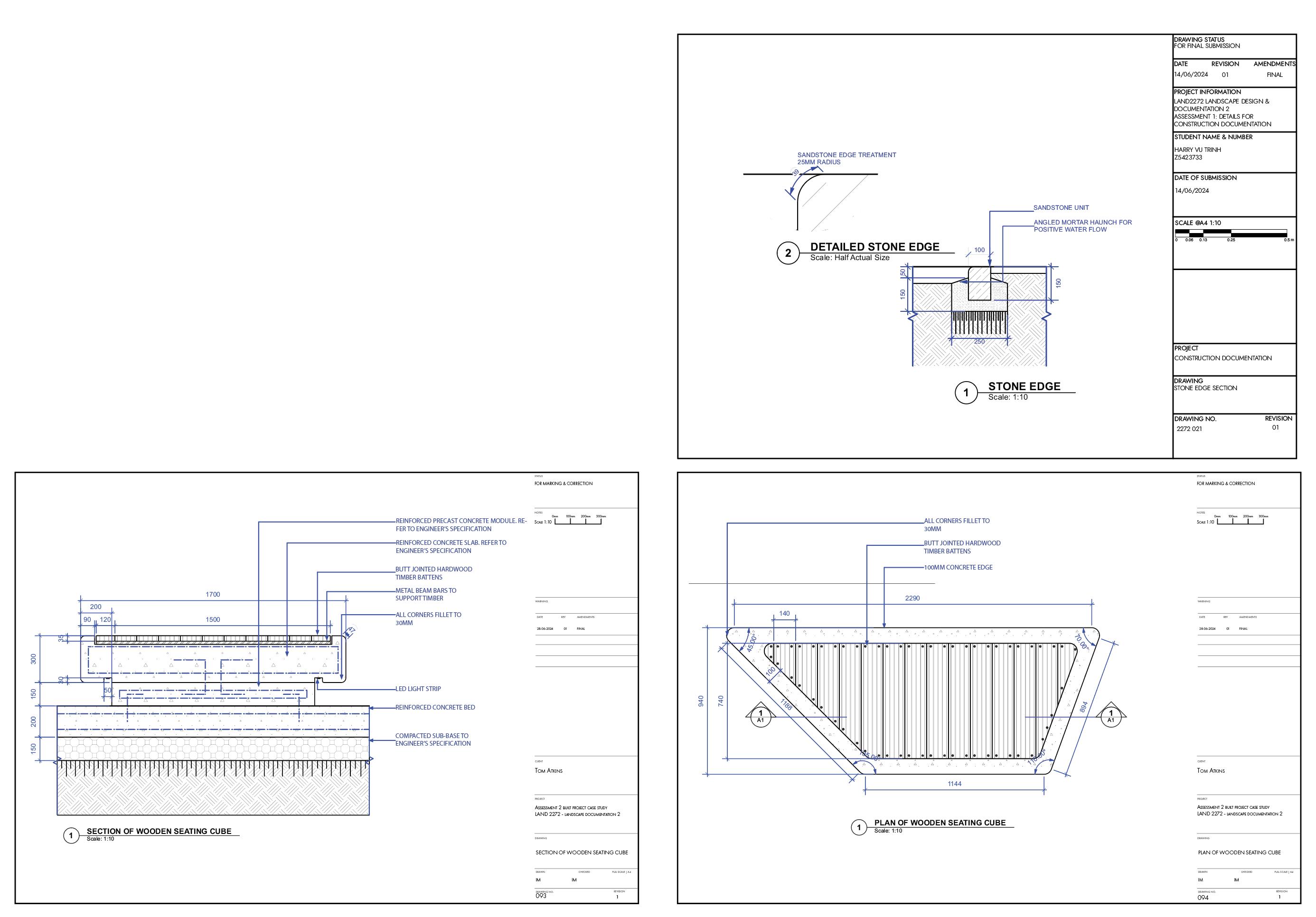My coursework in Landscape Documentation 1 and 2 provided me with a strong foundation in technical architecture drawing. Knowledge of drawing sheet setup, construction methods, primary materials, and industry standards is essential for my landscape design planning.