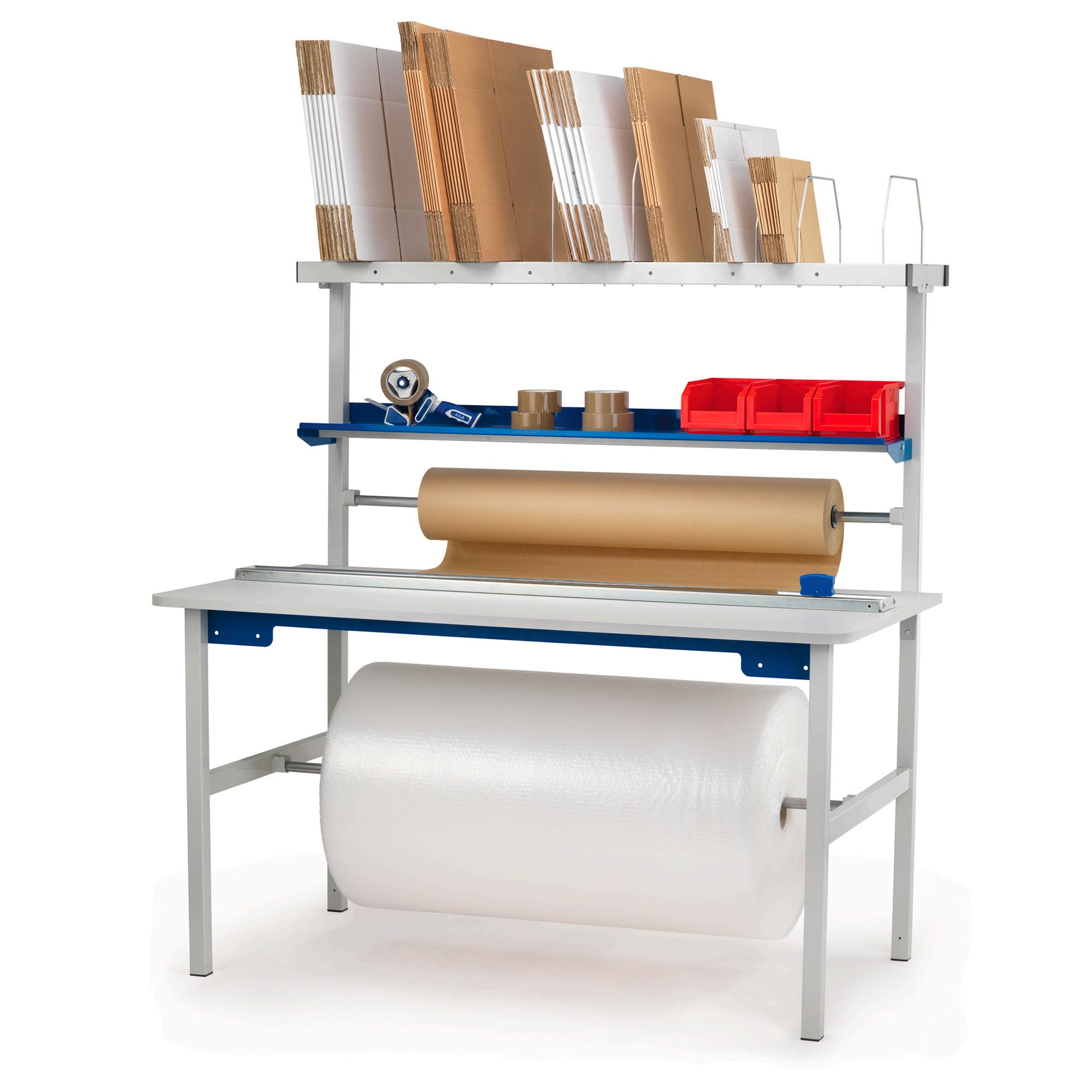 Kan fås i flere varianter Pakkebordene leveres komplett med 2 hyller samt papirkutter Bordplatene kan fås i 1600 og 2000 mm bredde, og en dybde på 800 mm. Bordplaten er 22 mm tykk. Det er 2 oppheng, en for pakkepapir og en for bobleplast. Toppmodellen har justerbare ben fra 720-970 mm.