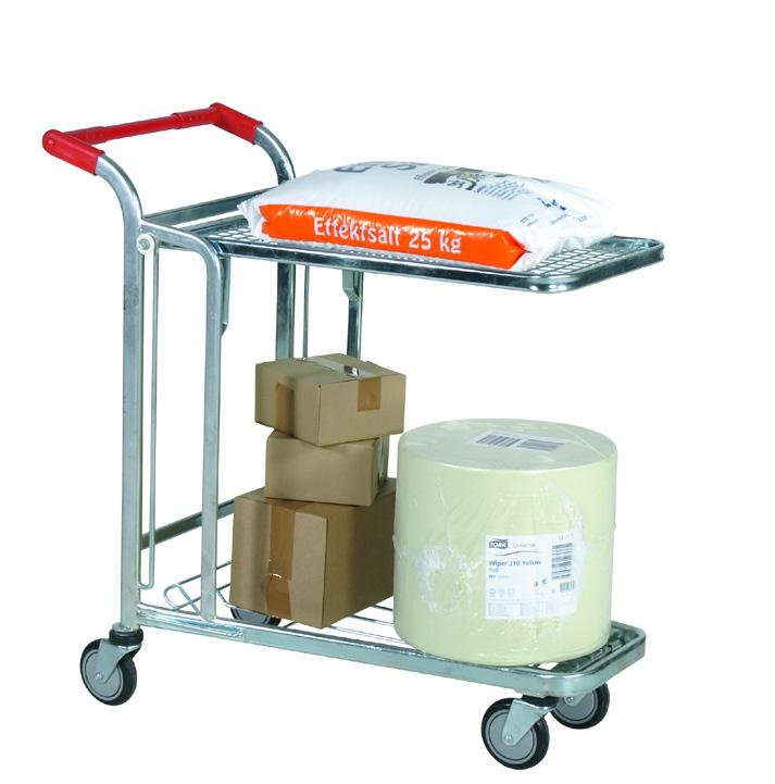 Overflaten er galvanisert og håndtaket er plastbelagt for bedre komfort. 4 stk gummibelagte 125 mm kulelagerhjul for stillegående og enkel håndtering. 640 mm mellom nederste og øverste hylle når utslått.