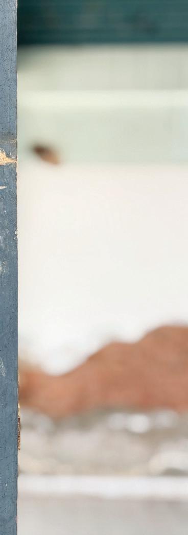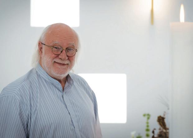 Jeg besøger Steen Bonde tidligt på dagen i hospitalets kirkesal til ugens middagssang. Rummet er lyst, arkitektonisk, enkelt og alligevel fyldt med nærvær. Langs væggene løber vand i smalle render, som en voldgrav der omfavner de tilstedeværende. På stolene ligger dagens salmer klar, og vi synger i kor. Der er patienter i hospitalstøj. Pårørende. Personale, der har taget en pause. Steen leder seancen med en pianist. Et par liturgiske bønner danner rammen. Før sidste sang inviterer Steen til en stund i stilhed, hvor vi lytter til vandets rislen.