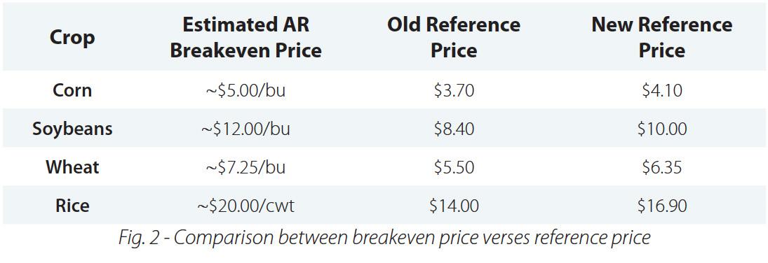 The increases restore part of the safety net’s value but do not fully keep pace with inflation. Arkansas data highlights how these policy benchmarks compare to actual farm economics. Enterprise budgets from the University of Arkansas Division of Agriculture show production costs continue to rise across major row crops. When converted to breakeven prices, those costs exceed both old and updated reference prices (figure 2). This gap reflects a core feature of modern farm programs. PLC payments help reduce losses but are not designed to ensure profitability. Even with higher reference prices, support levels remain below the cost of production for many Arkansas farms.