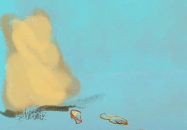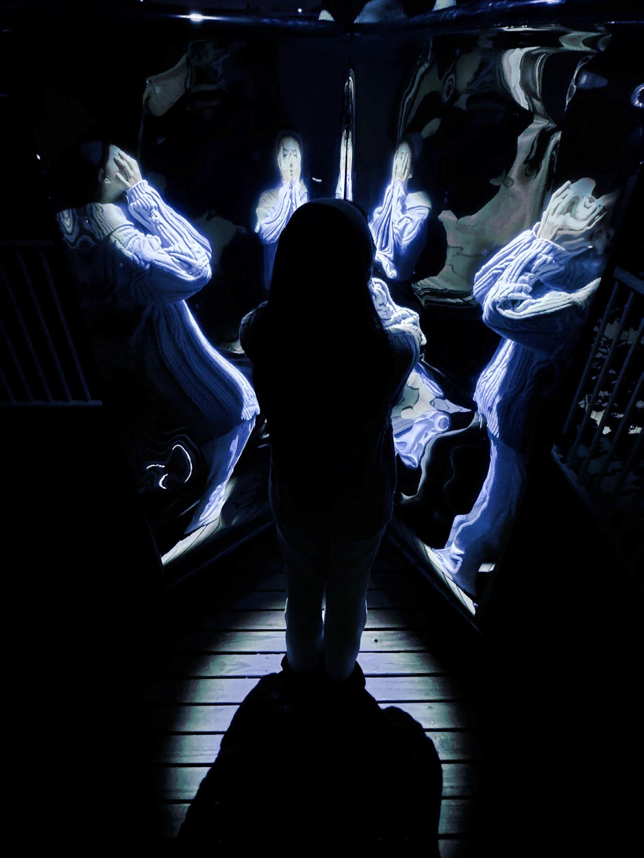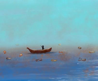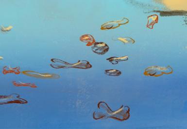 The �loating fragments symbolize fragile memories, while the changes in seawater re�lect the impermanence of forgetting.