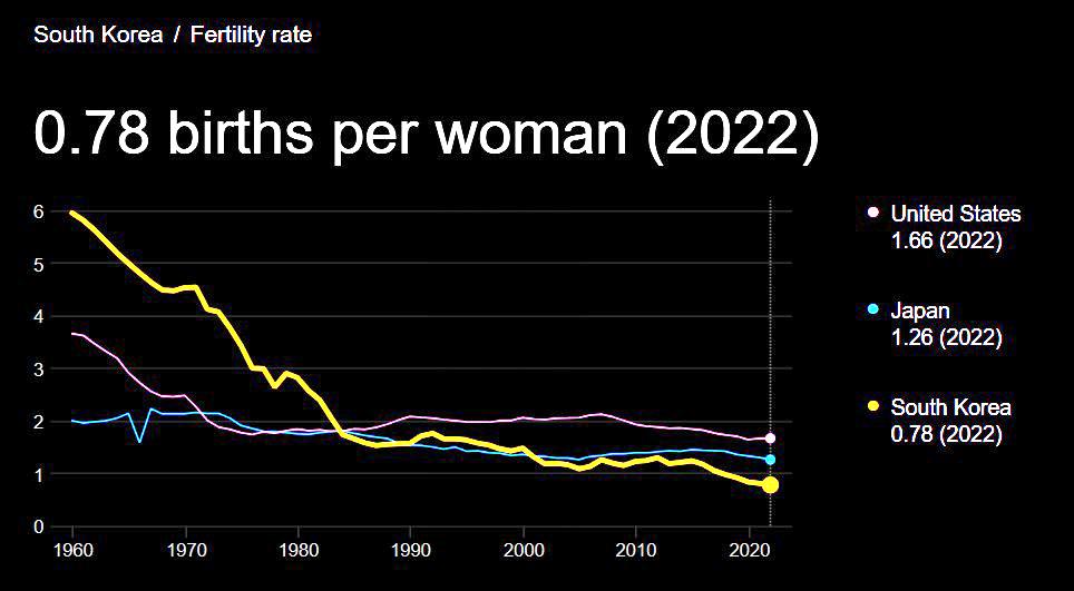In South Korea, the low fertility rate has become a national emergency. Experts warn that if the fertility rate continues to decline, South Korea's population could shrink by two-thirds by the end of the century. Korean newspapers are filled with reports about the closure of kindergartens, the expansion of baby bonuses, and debates over whether it might be necessary to draft women into the military to meet quotas.