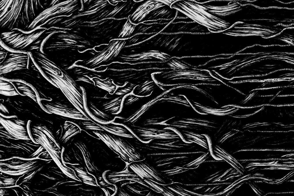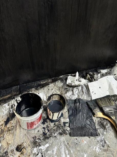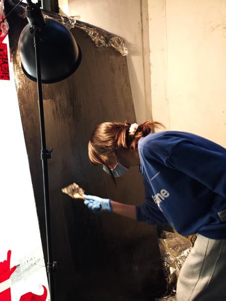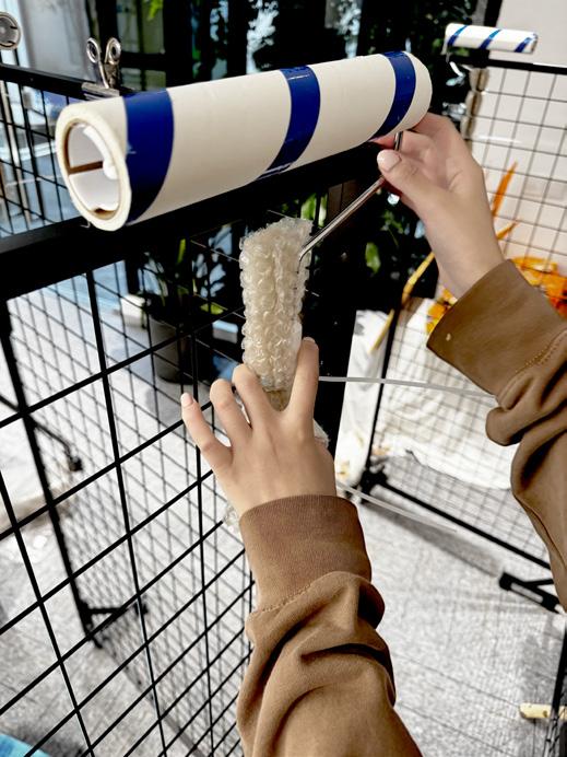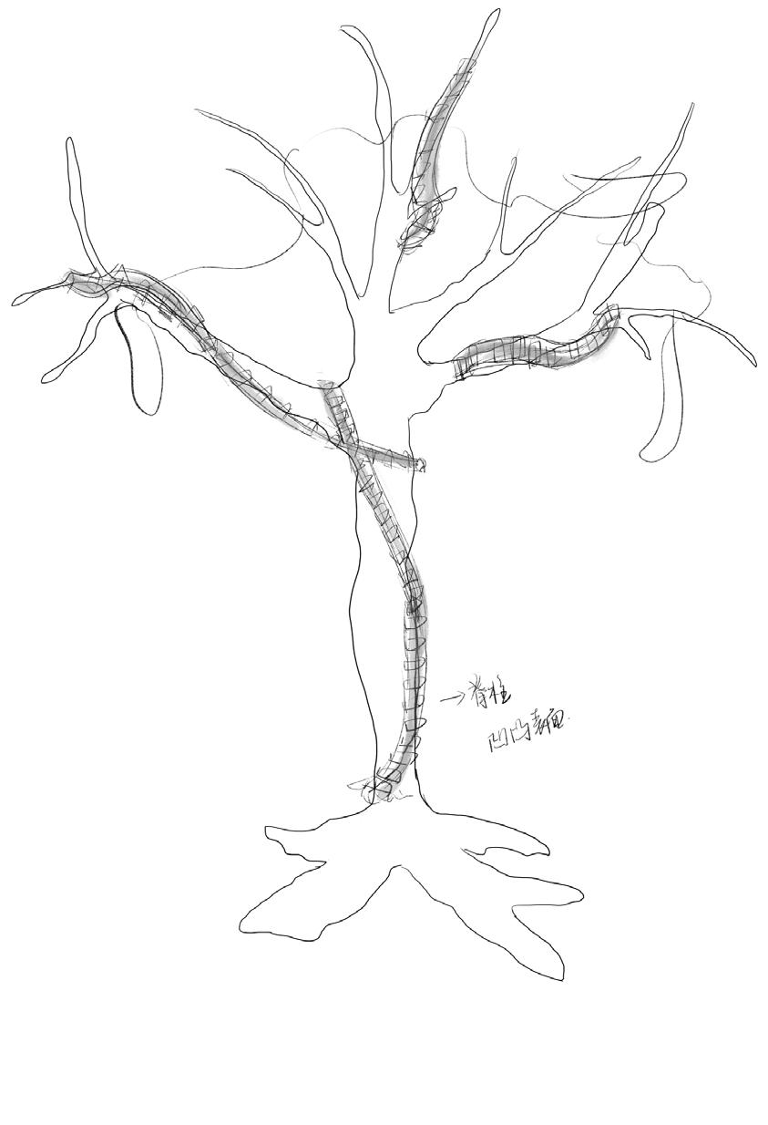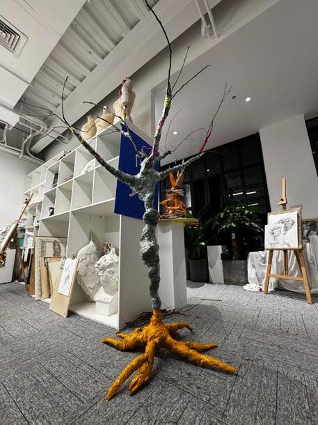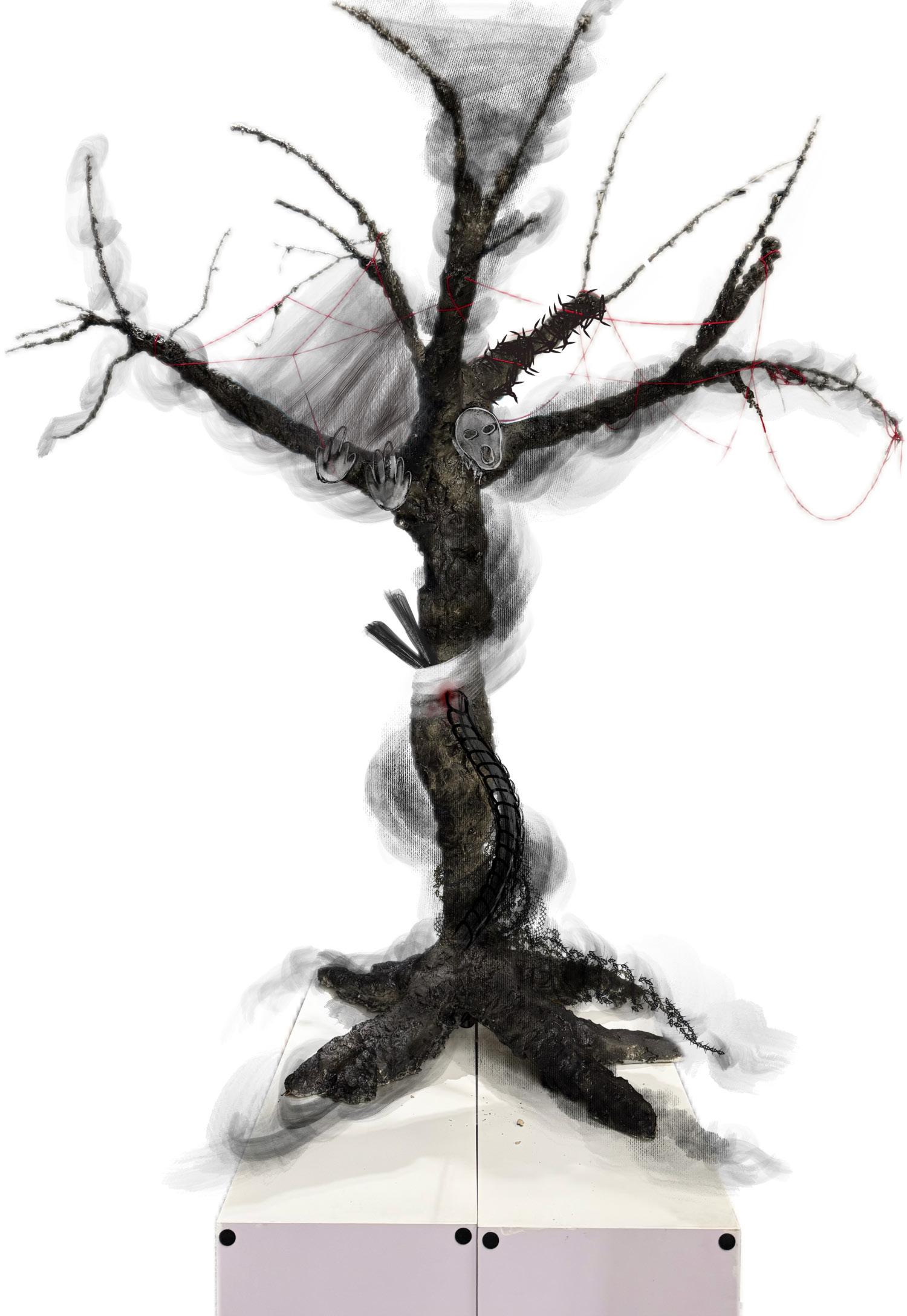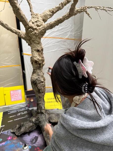 First, construct the tree's framework using wire to ensure the structural support. Then, use foam glue to shape the initial form of the tree. Once it has dried, carve and re�ine the texture and details of the trunk. Next, cover the tree's surface with clay. Finally, apply black spray paint over the entire tree to create a uniform black appearance.