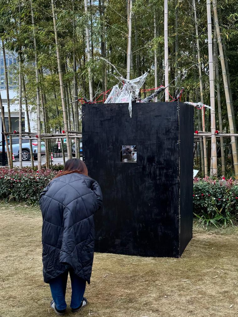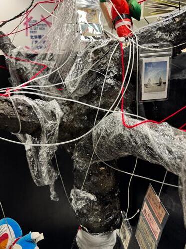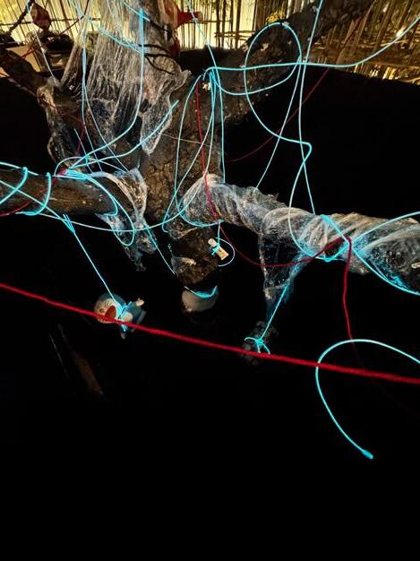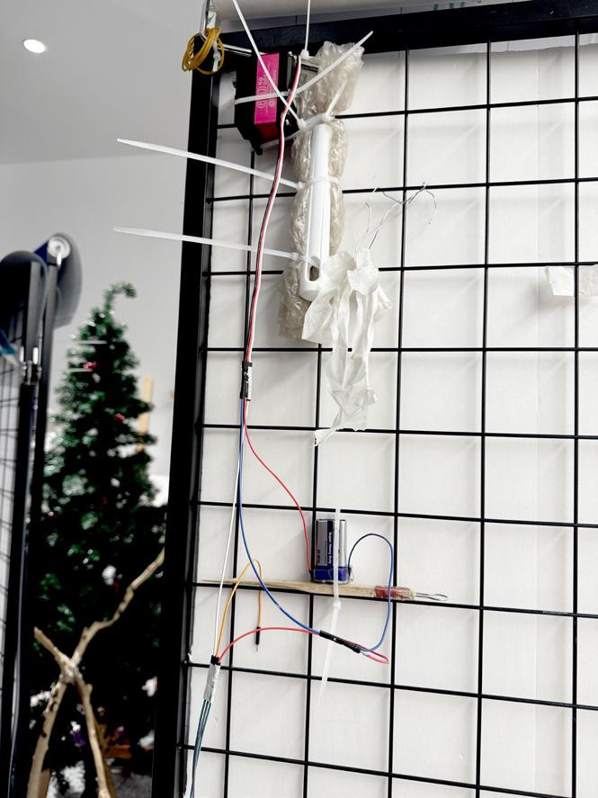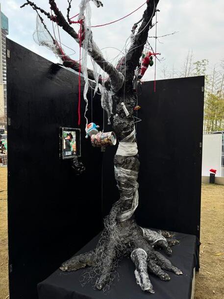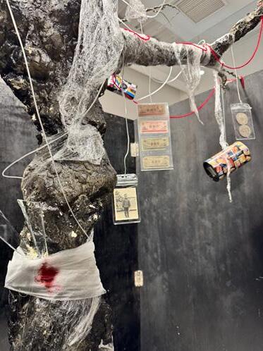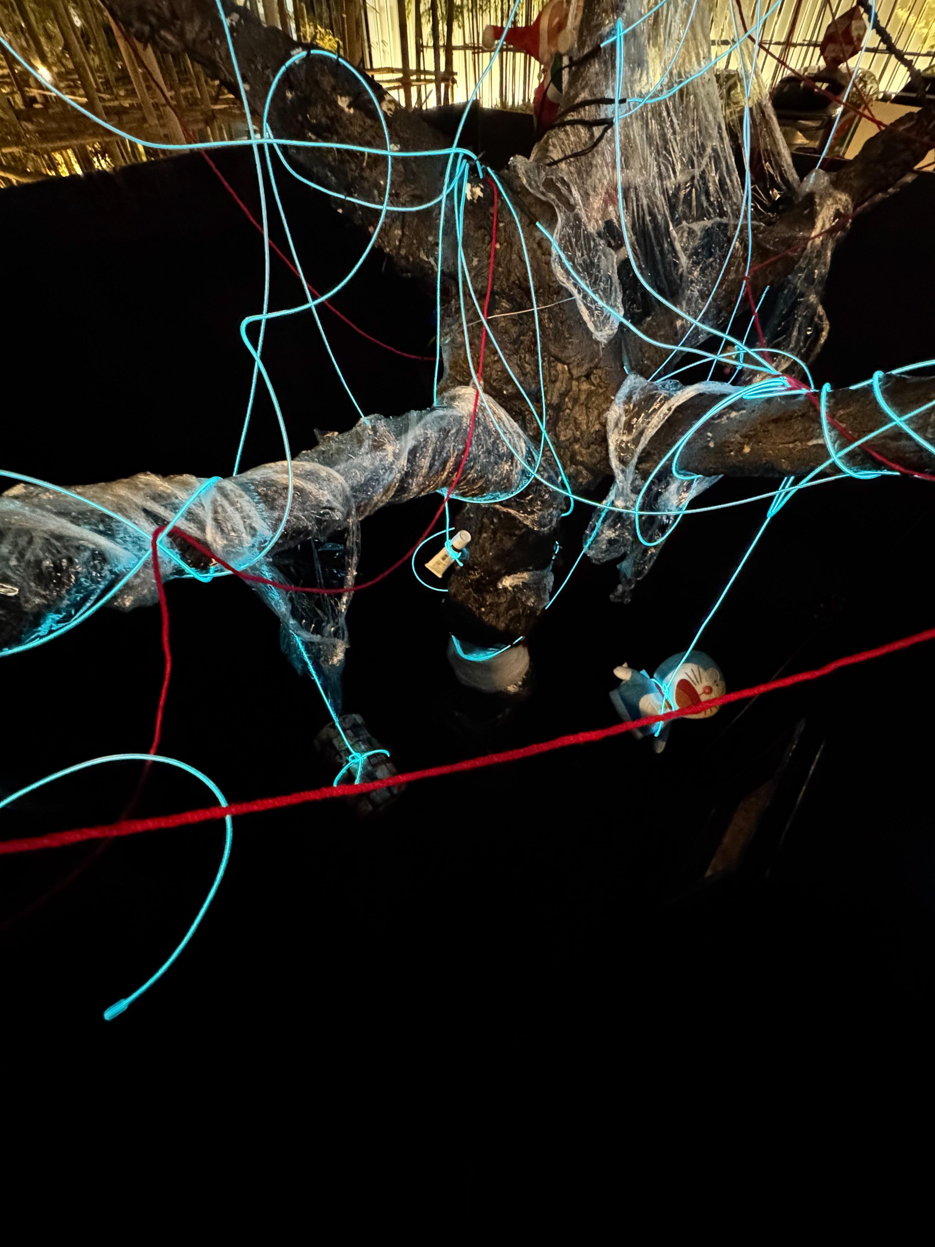 This installation combines Arduino to control servos and ultrasonic sensors, enabling interaction with the audience. When a person approaches, objects hanging from the tree descend. The use of plastic wrap symbolizes the passage of time and the fragility of materials, while the red thread represents the inseparable emotional bond between humans and memory. The structure and texture of wire and gauze further emphasize the aging of the tree and the marks of environmental pollution. Through the integration of these elements, the visual expression of historical depth is enhanced, profoundly re�lecting the dual themes of environmental degradation and memory decline in modern society.