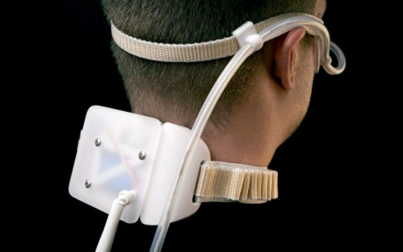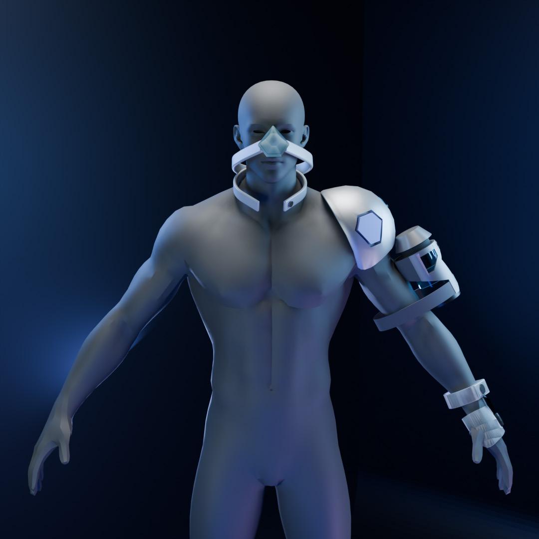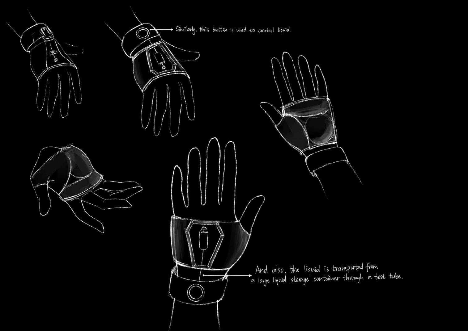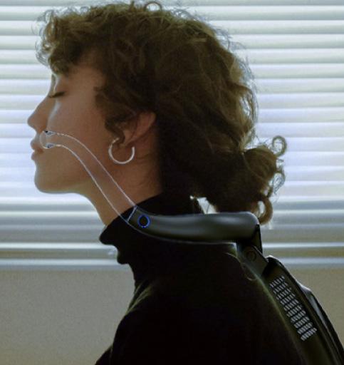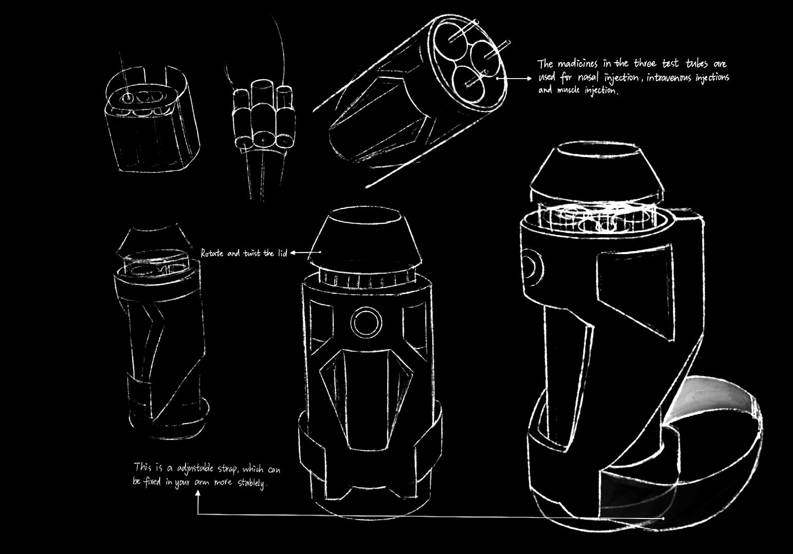 The device adopts a lightweight design, using modern materials such as transparent resin to ensure structural durability while reducing the burden on the wearer. Its appearance is sleek and exudes a futuristic technological aesthetic, reflecting the seamless integration of technology and physiological function. Equipped with smart sensors and a feedback system, the device dynamically adjusts the drug delivery volume based on the user's physiological responses. It not only provides physiological support but also, through interactive design, prompts profound reflection on drug dependency and the oss of natural physiological mechanisms.