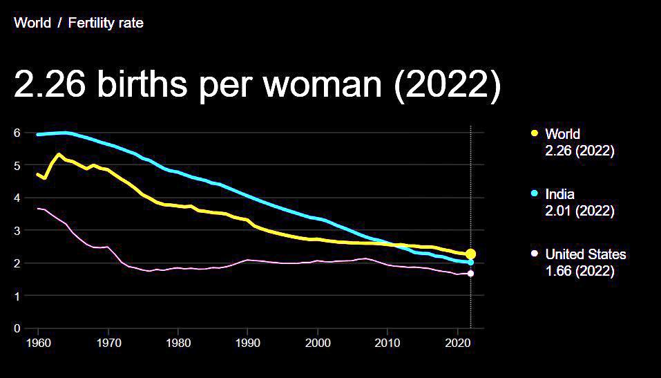 As of 2021, more than half of the world's countries had fertility rates below the population replacement level. In countries like South Korea and Serbia, the average number of children born per woman is less than 1.1. Over the coming decades, global fertility rates are expected to decline further, reaching approximately 1.8 by 2050 and 1.6 by 2100, far below the replacement level.
