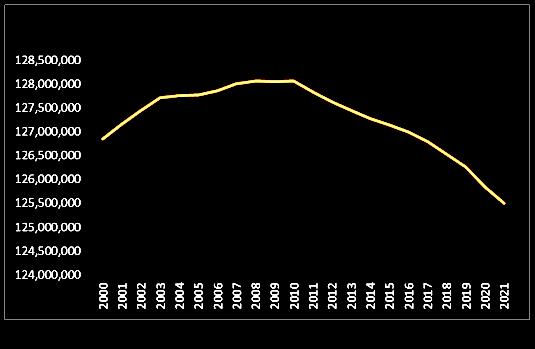 As of October 1, 2021, Japan's total population was just over 125.5 million, a decrease of 644,000 compared to the same time the previous year. This marks the 11th consecutive year of population decline in Japan and the largest drop since records began in 1950.