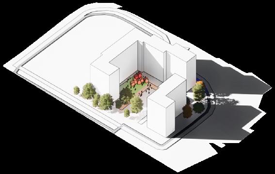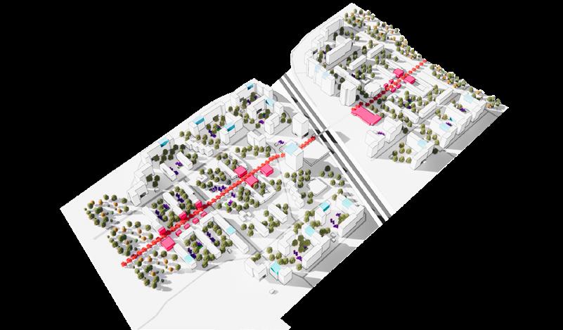 The interventions are split over 3 scales of actions which are envisioned to occur over a span of 10 years. Beginning at the community scale (1 minute walk), smaller interventions begin early on such as the installation of the flexible pods which begin to activate the community and create a local economy. Scaling up to large infrastructure intervention in the mid term such as mobility changes and building of an elevated green link and new residential buildings. Starting from the community scale to impact the direct community and slowly scale up to enhance the entire district.